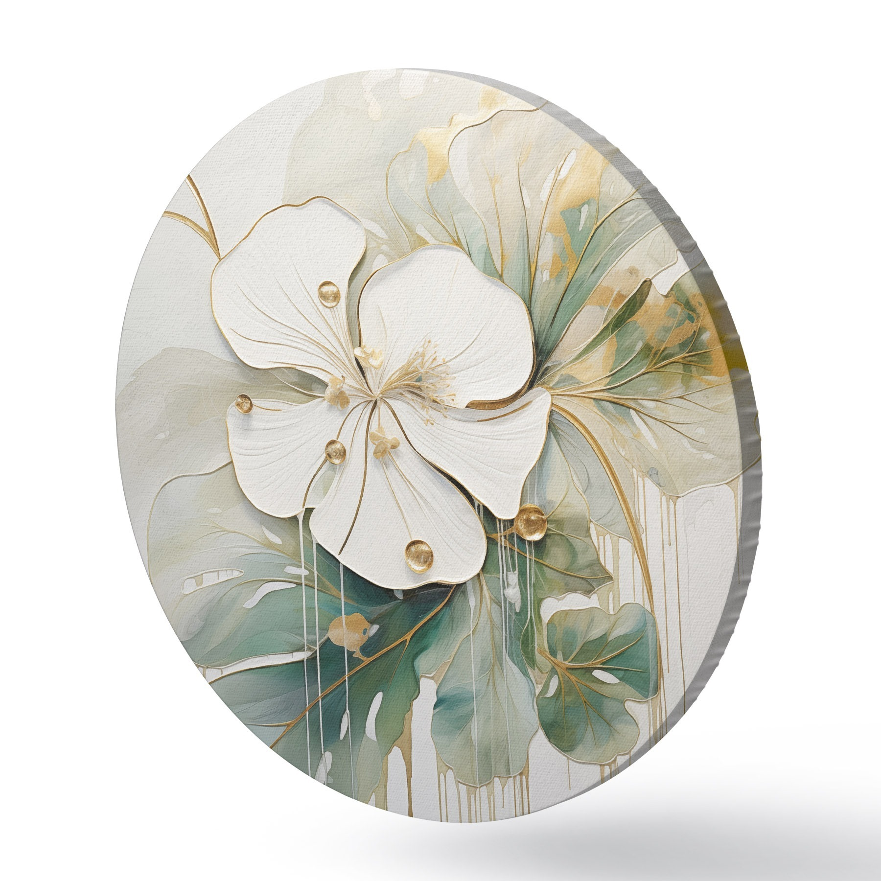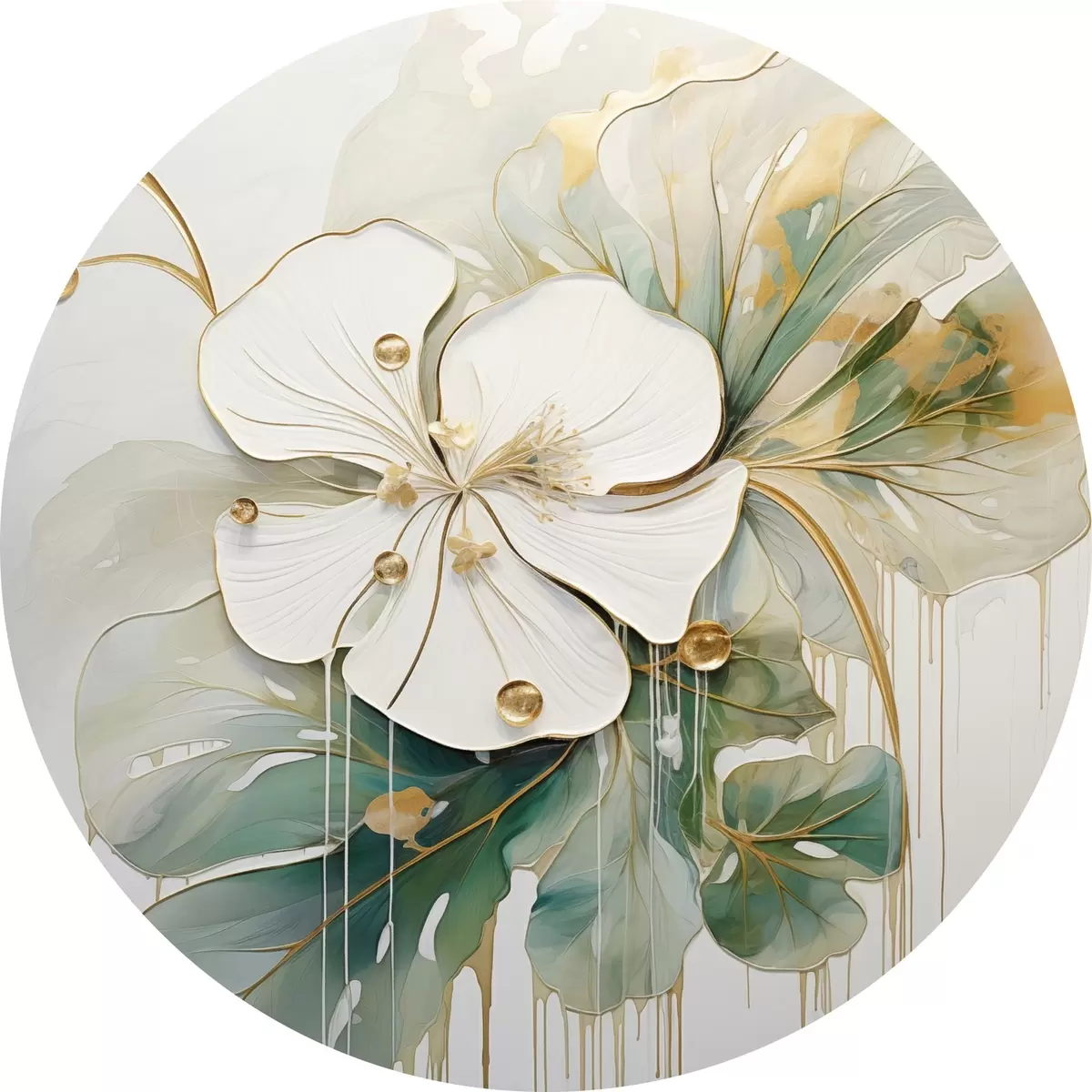 Apvalūs paveikslai Balta gėlė su geltonai oranžiniais akcentais ir žaliais lapais r45815