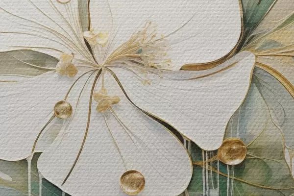 Nuotrauka Balta gėlė su geltonai oranžiniais akcentais ir žaliais lapais Nr r45815