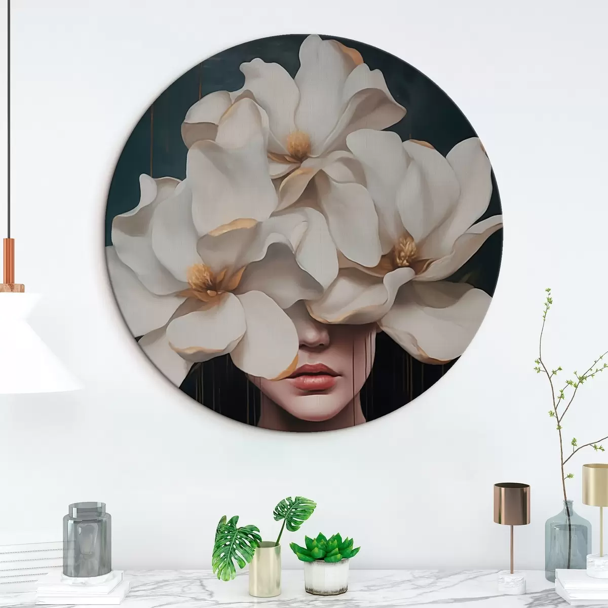 Apvalūs paveikslai Moteris su baltomis gėlėmis ant galvos r45843