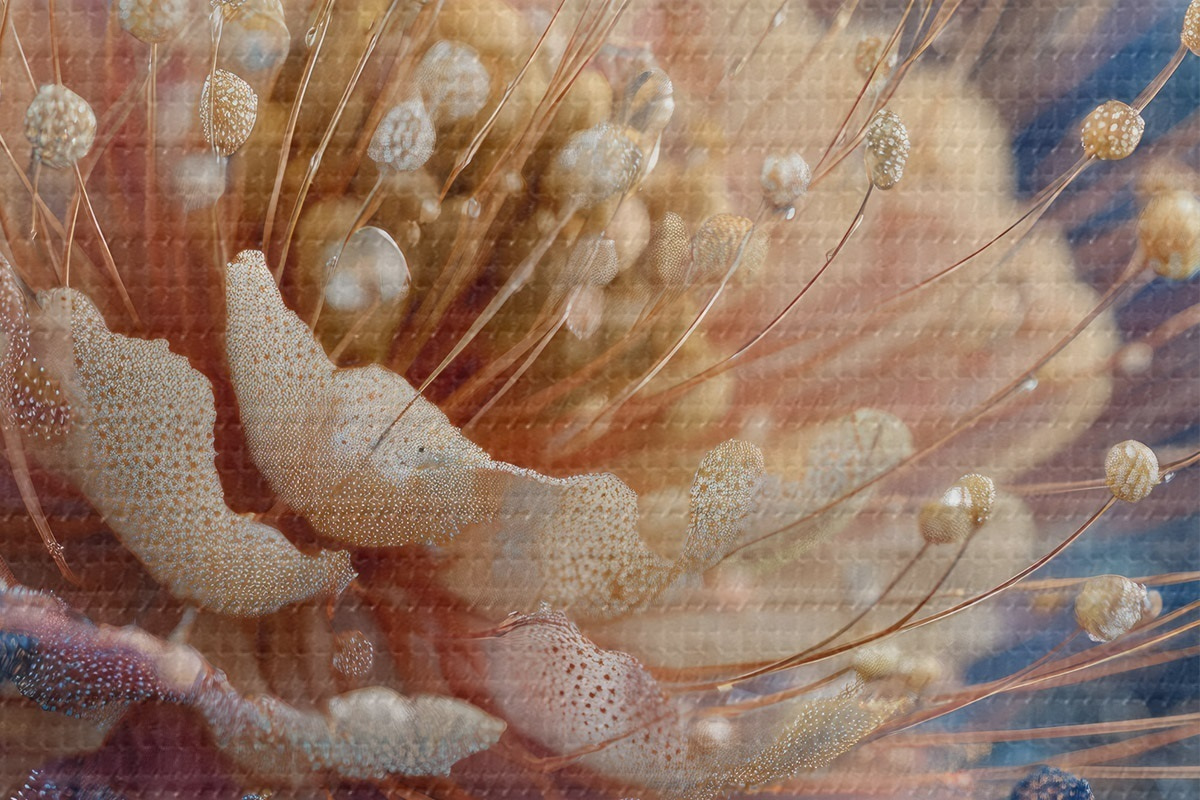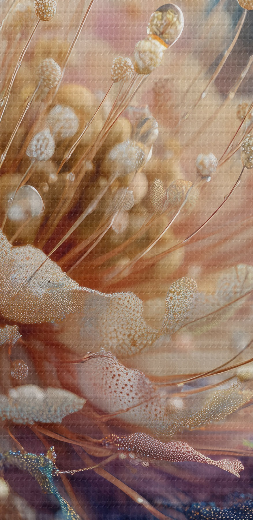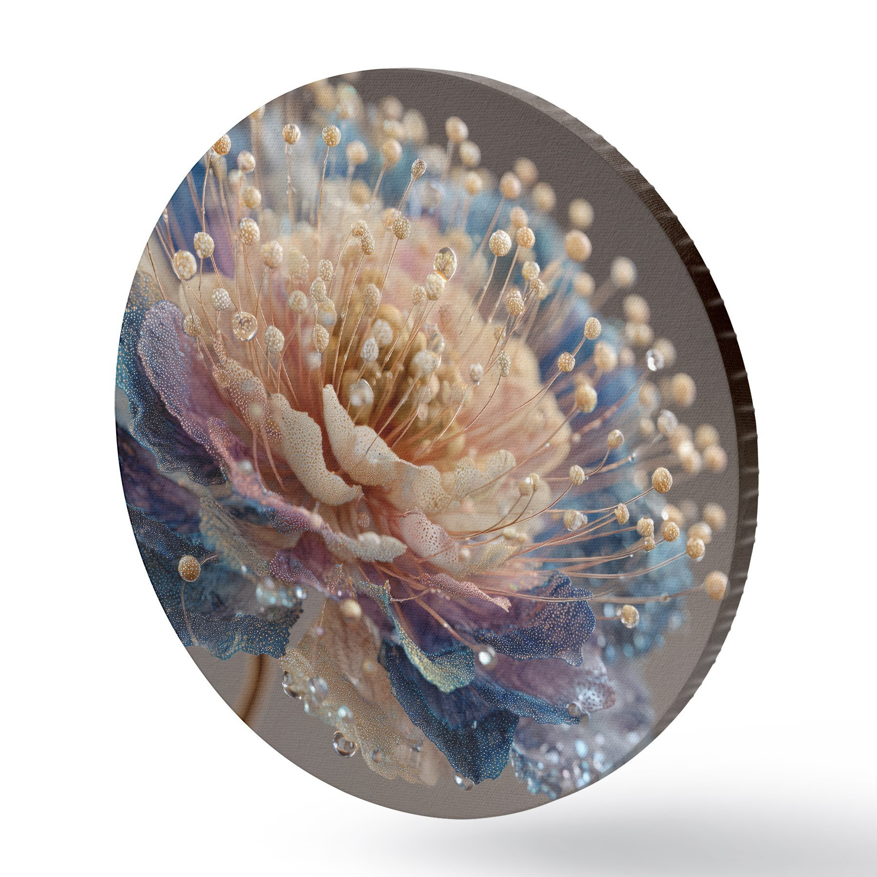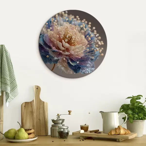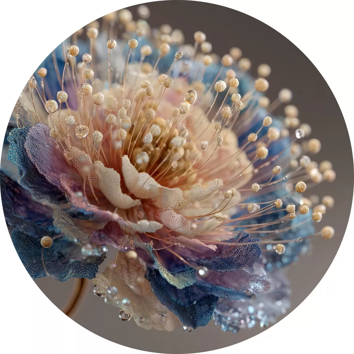 Nuotrauka Perlamutrinė gėlė su rasos lašeliais, persikų ir mėlynų spalvų žiedlapiais Nr r45911
