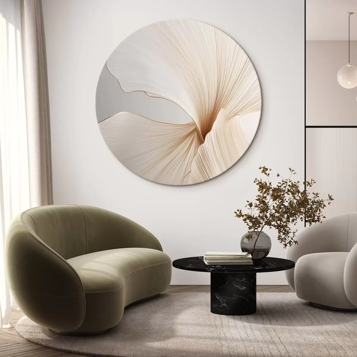 Apvalūs paveikslai Abstrakčios gėlės su plonais, subtiliais žiedlapiais, balto ir smėlio atspalvių r45923