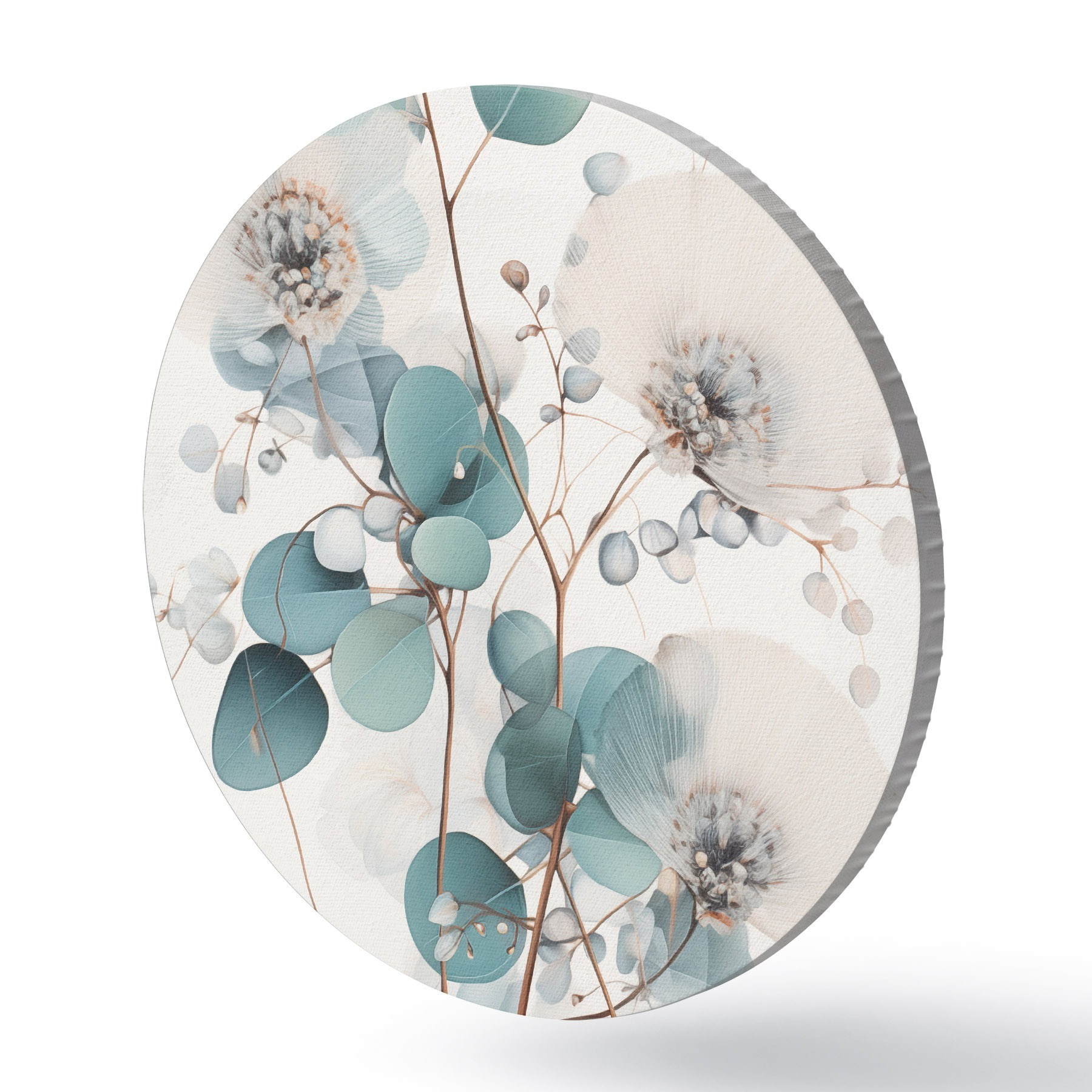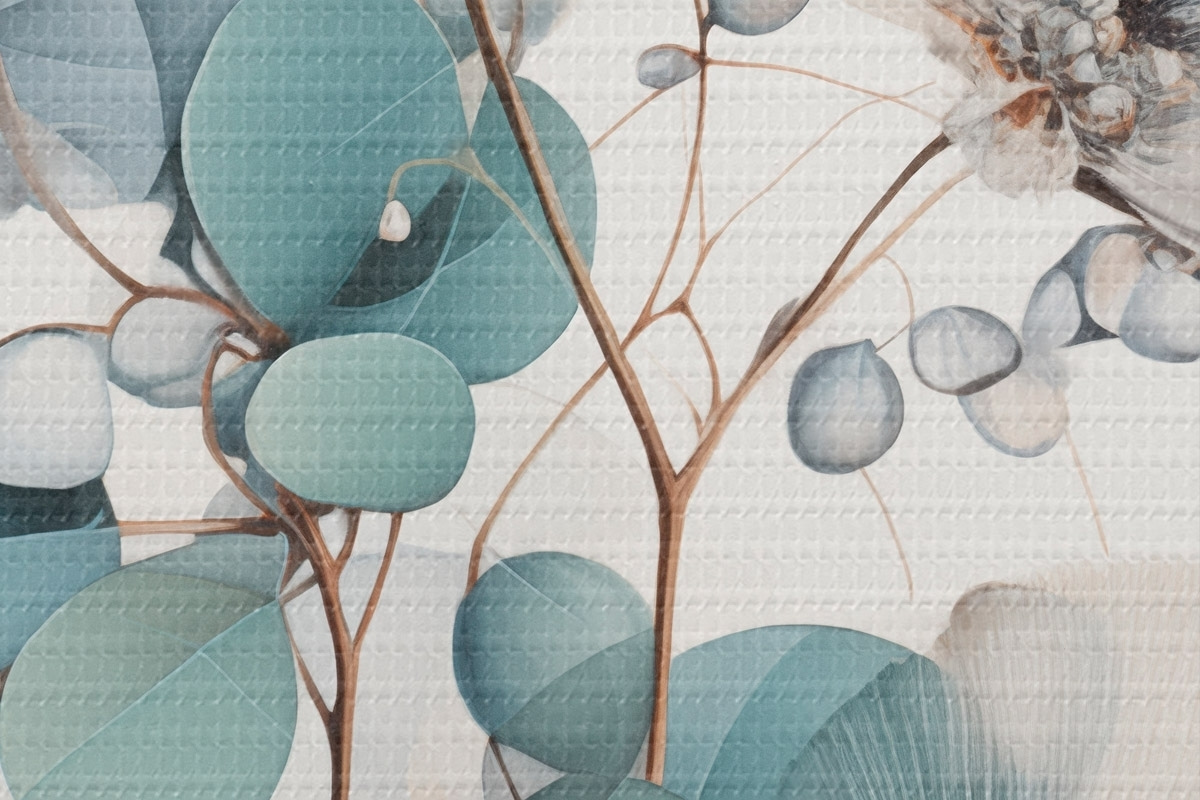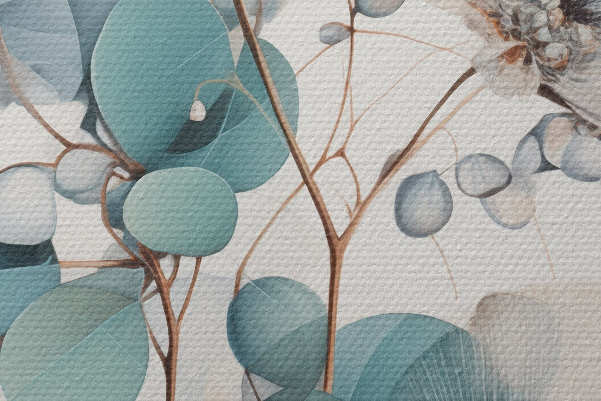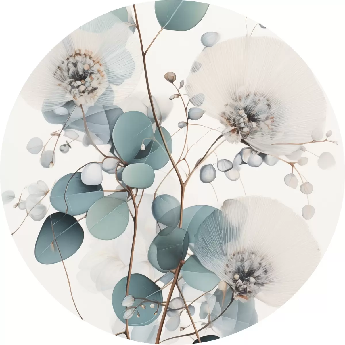 Nuotrauka Eukalipto abstrakčios gėlės su baltais žiedlapiais, švelniai žalios lapai ant šakų Nr r45946