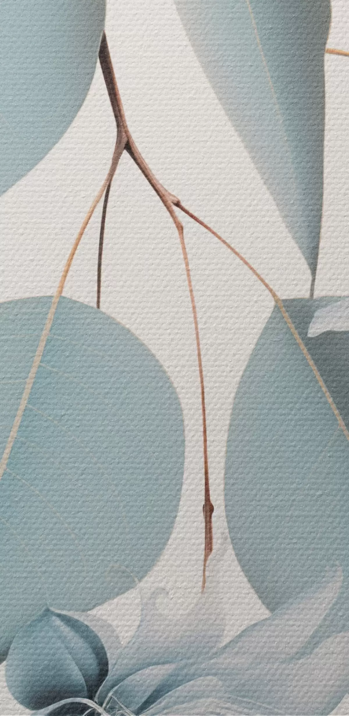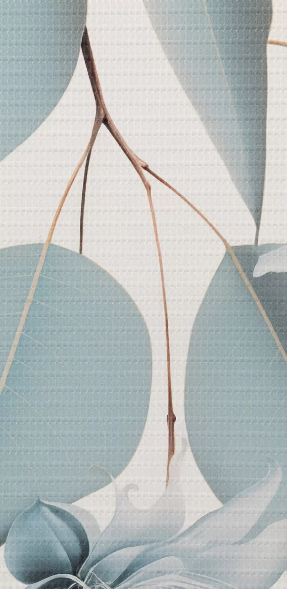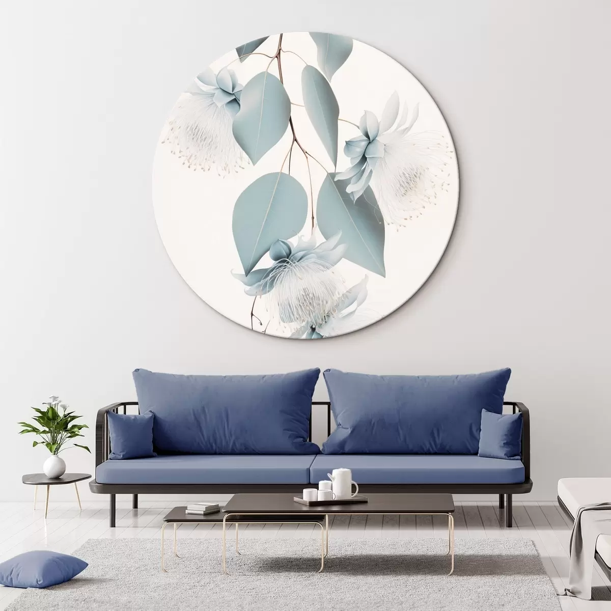Nuotrauka Eukalipto šaka su mėlynais lapais ir baltais žiedais, šviesus fonas Nr r45947
