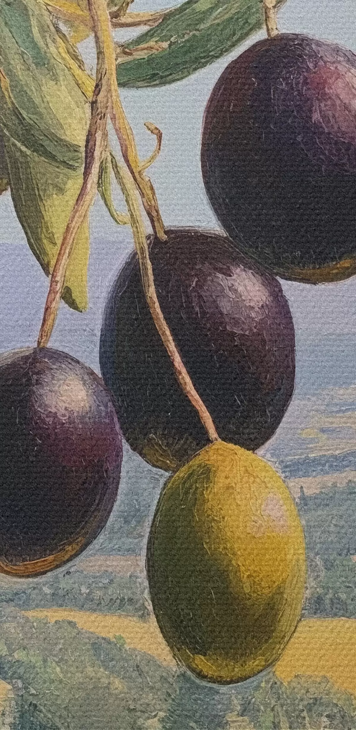 Nuotrauka Alyvuogių šakelė su tamsiais vaisiais vasaros peizažo fone Nr r46150