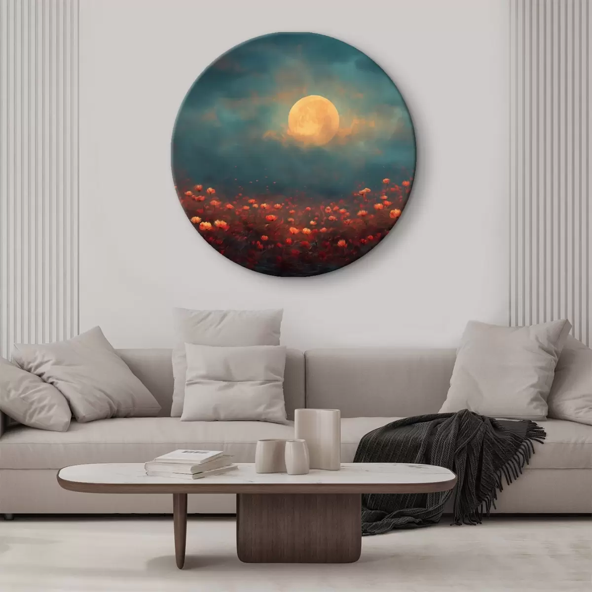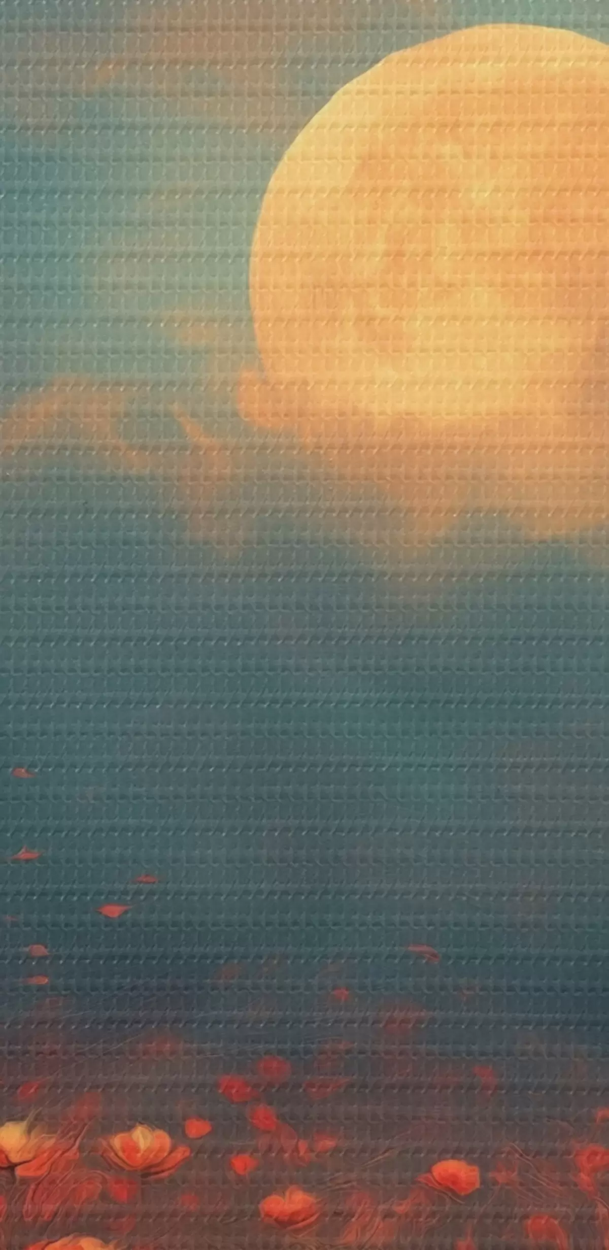Nuotrauka Mėnulis virš raudonų gėlių lauko rūko apgaubtame vakaro danguje Nr r46167