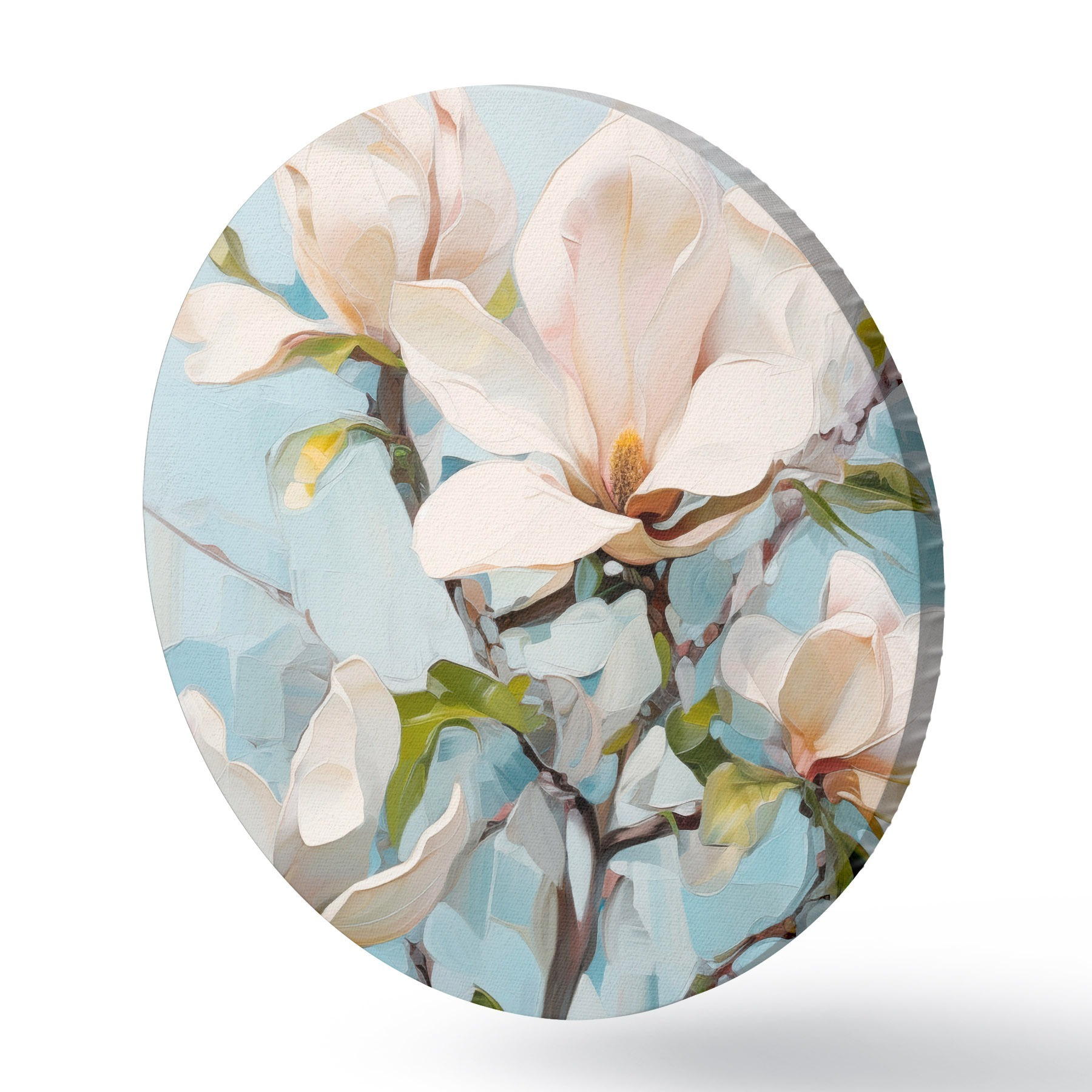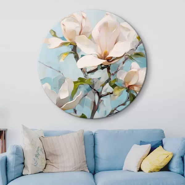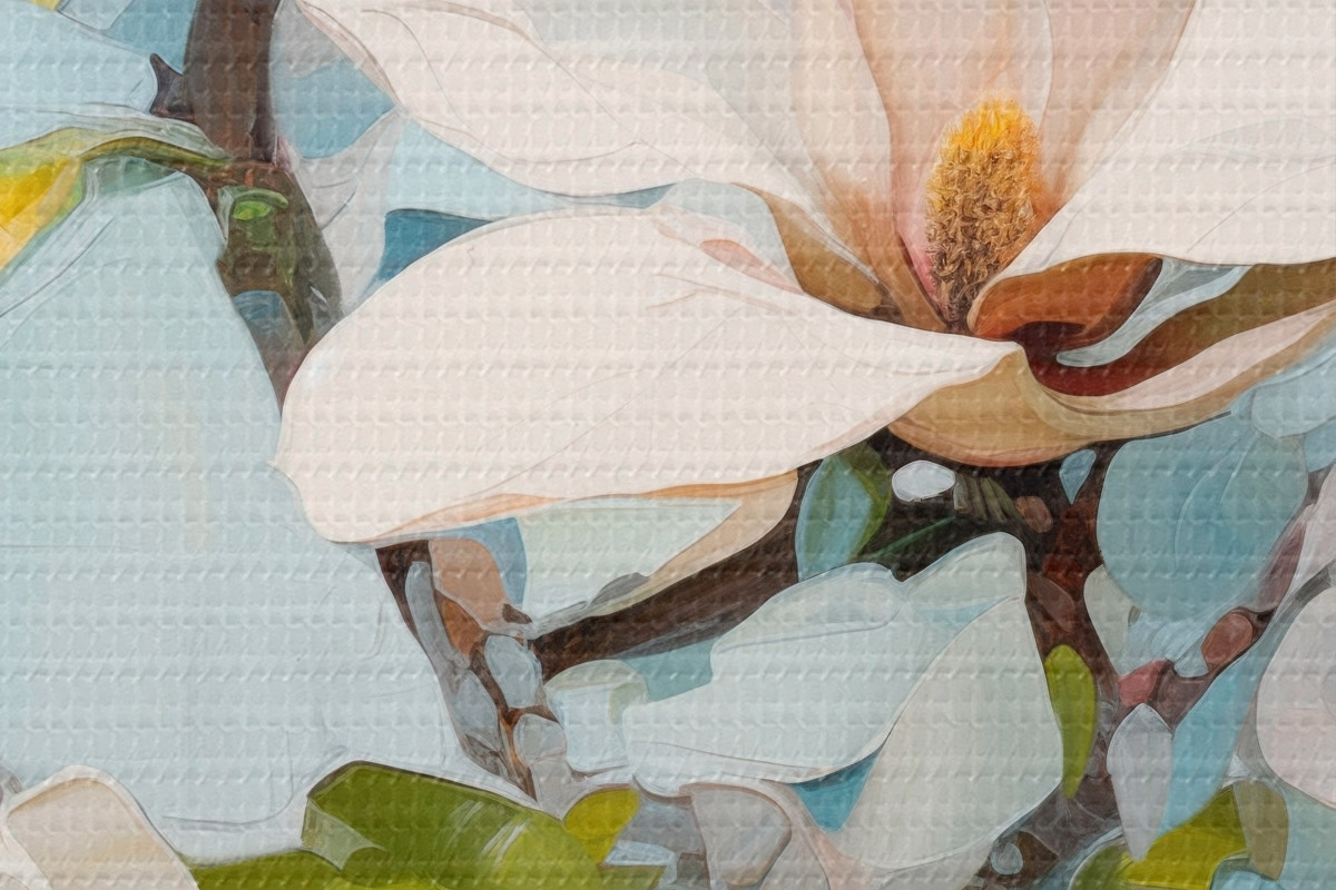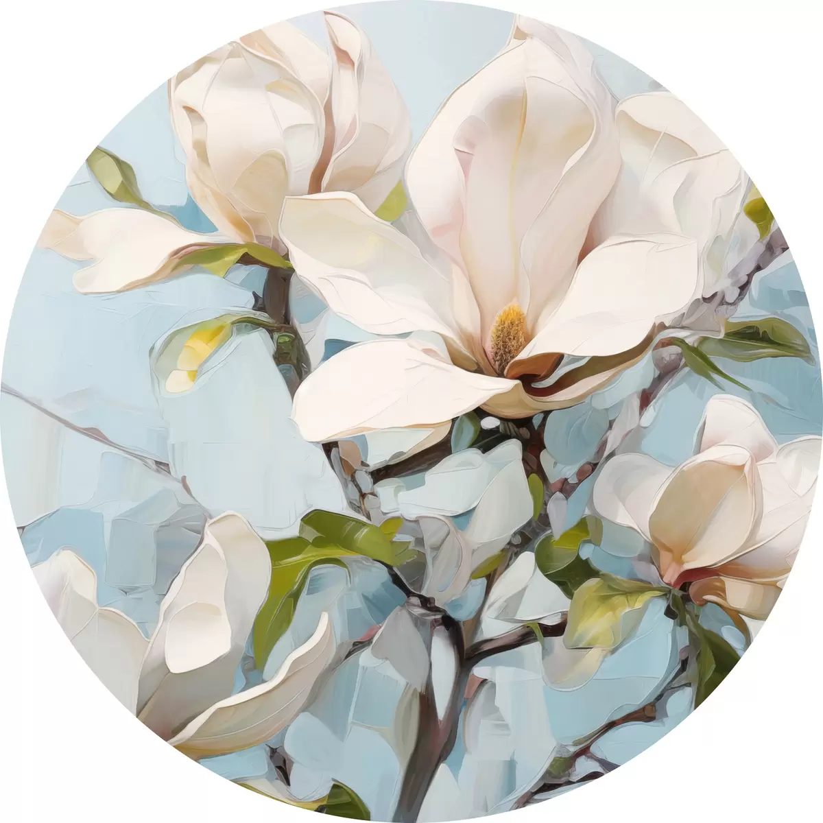Nuotrauka Balta magnolija, šviesiai mėlynas fonas su švelniais teptuko potėpiais, aliejaus tapybos stilius, impasto tekstūra Nr r46277
