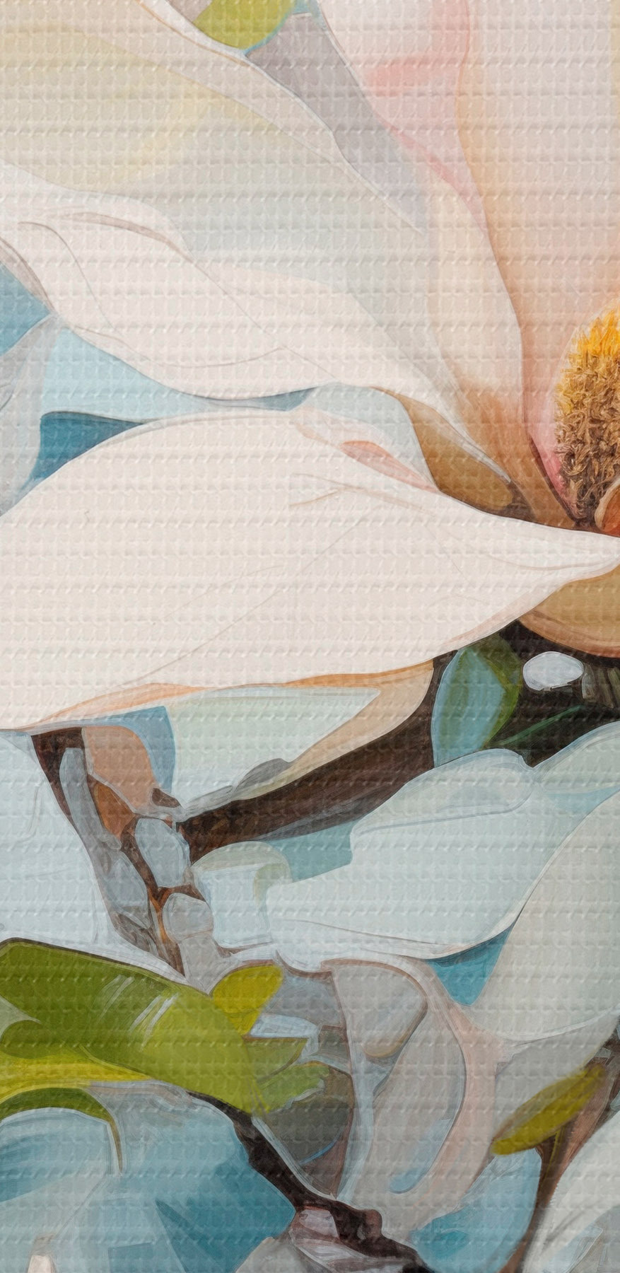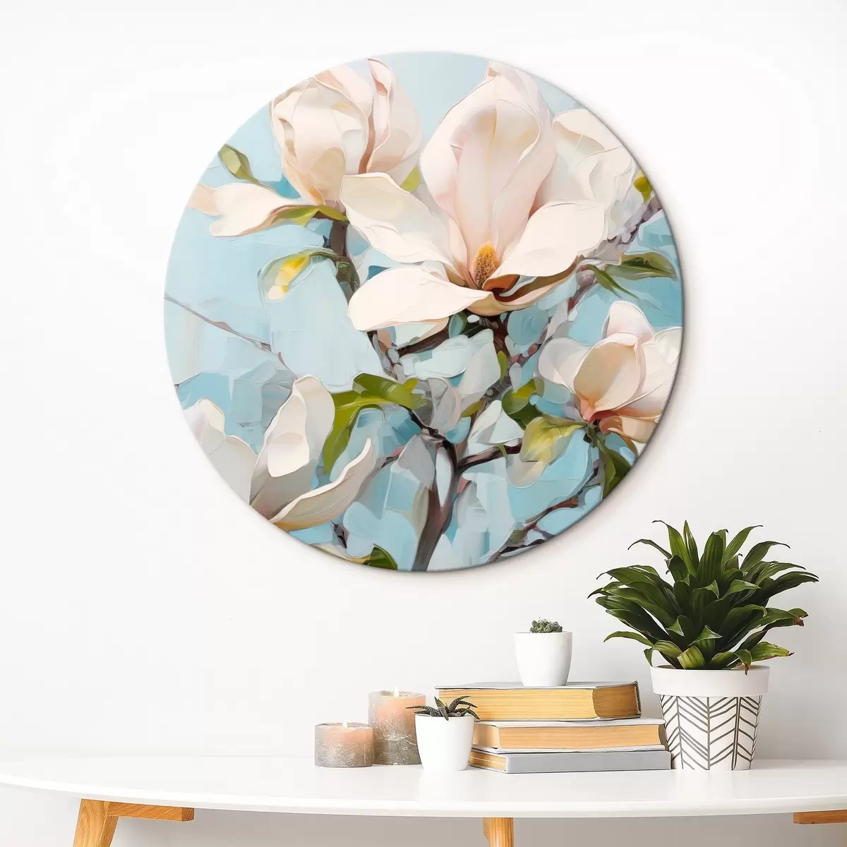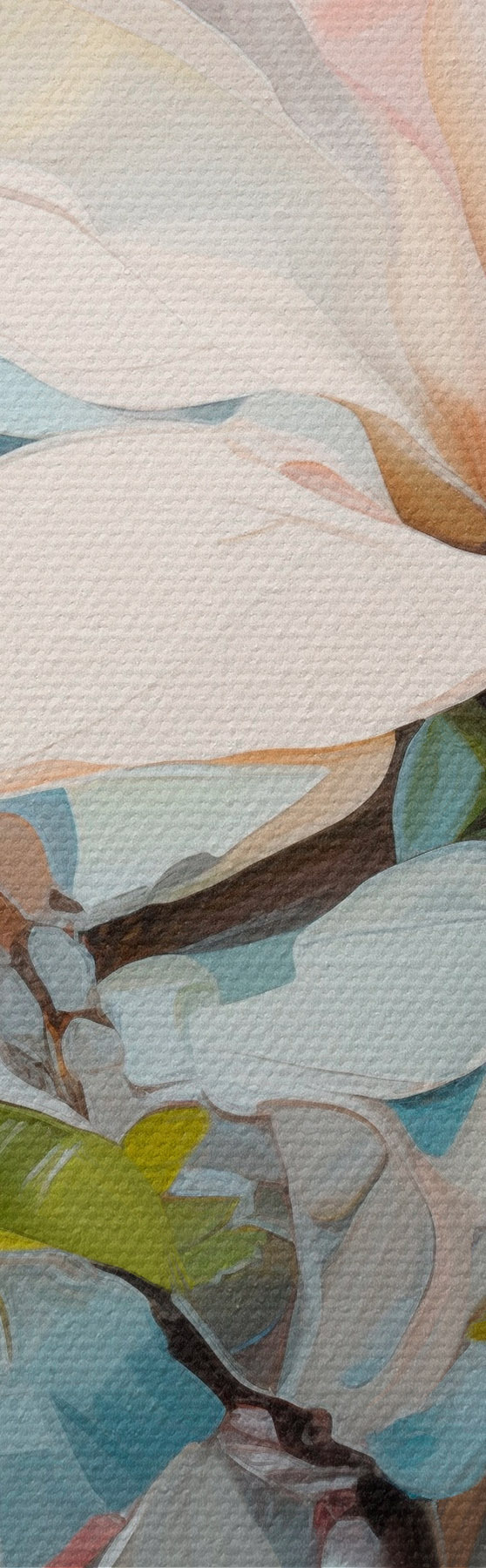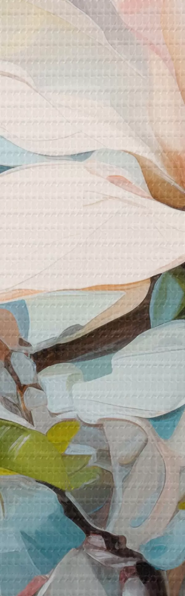 Nuotrauka Balta magnolija, šviesiai mėlynas fonas su švelniais teptuko potėpiais, aliejaus tapybos stilius, impasto tekstūra Nr r46277