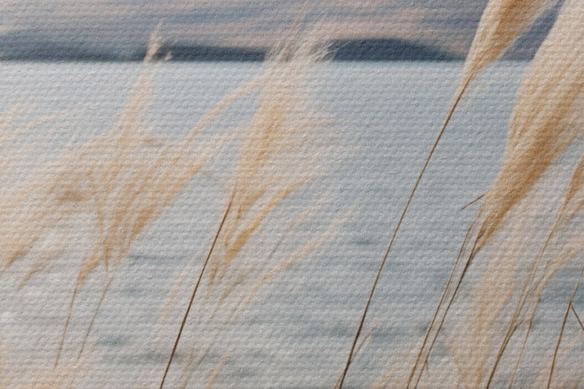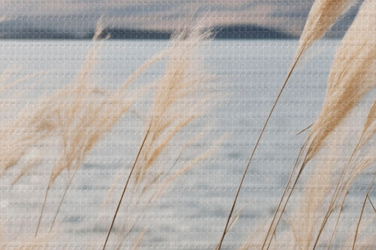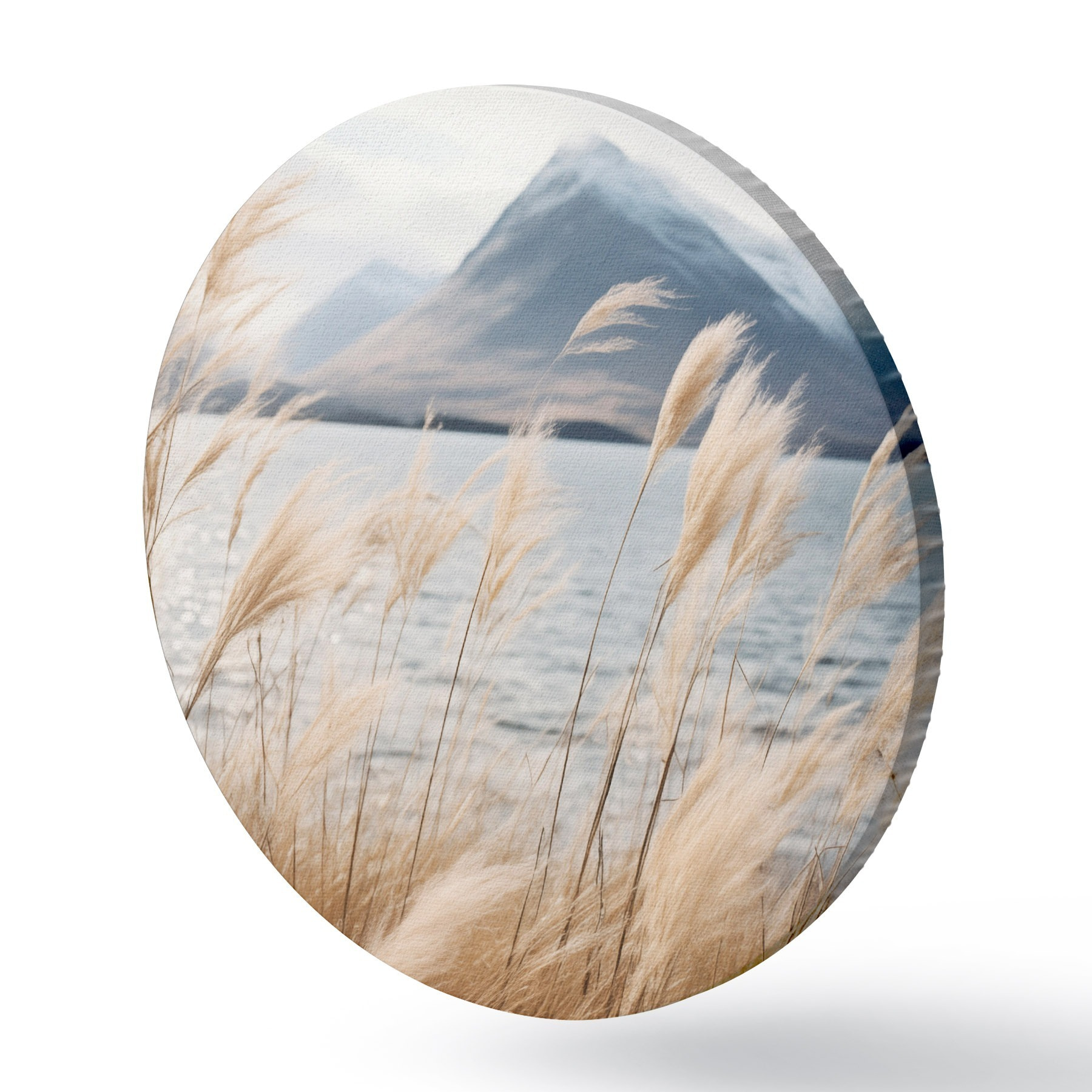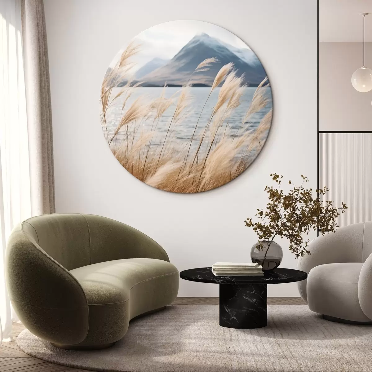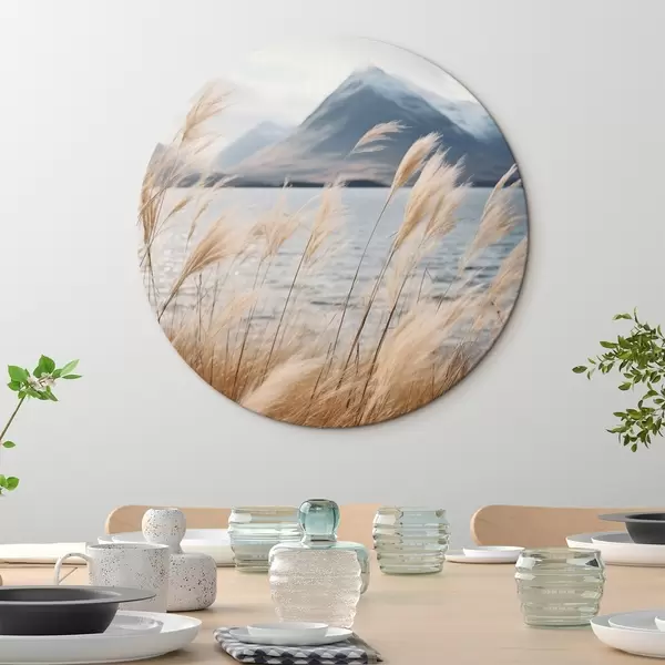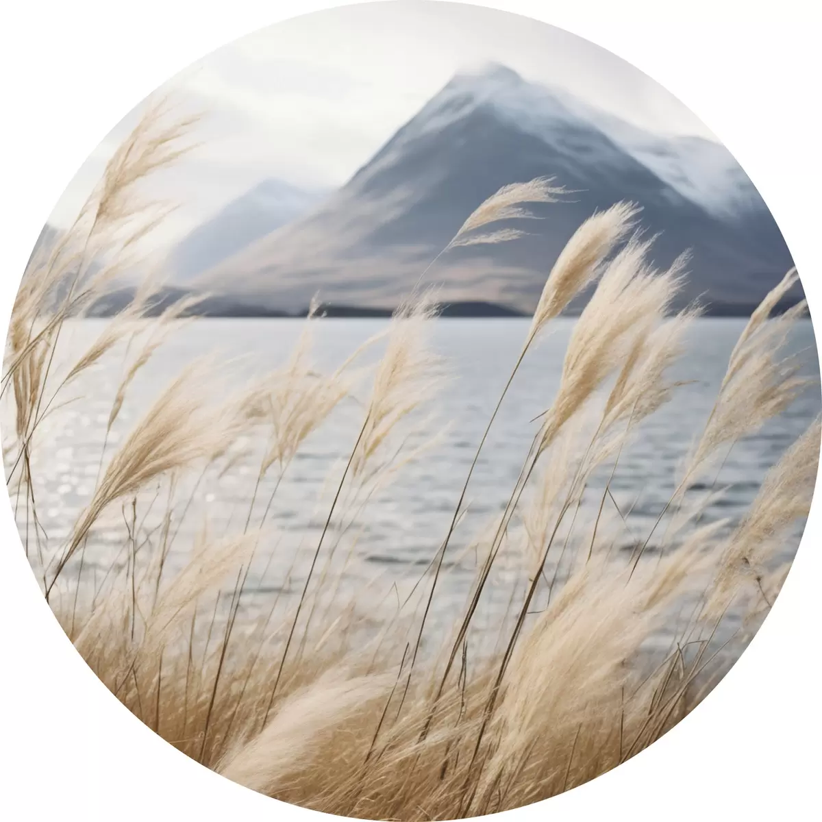 Nuotrauka Pampų žolė su ežeru ir kalnais fone, švelnus apšvietimas, prislopintos spalvos, natūralistinis stilius Nr r46283