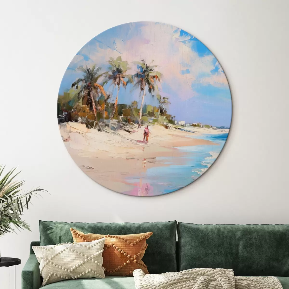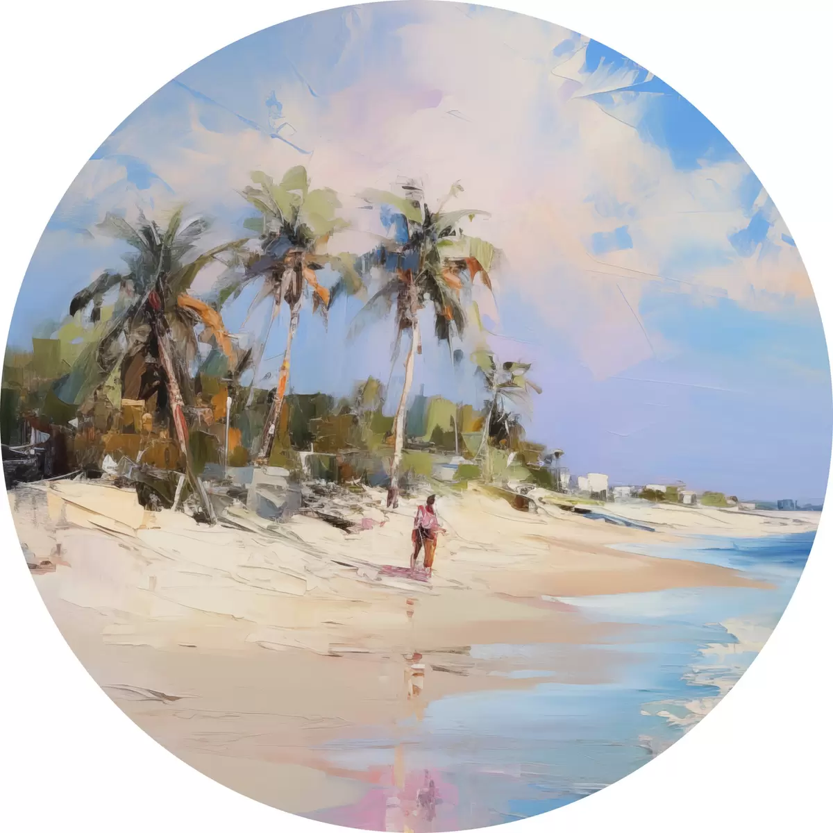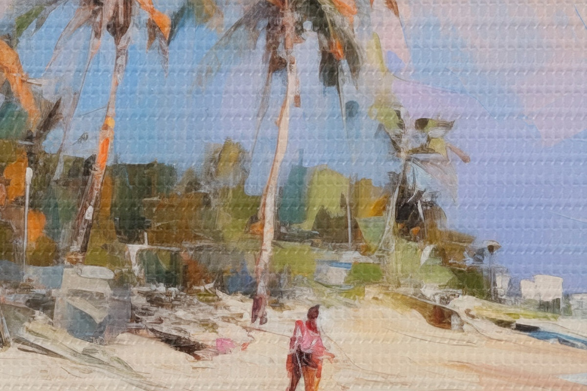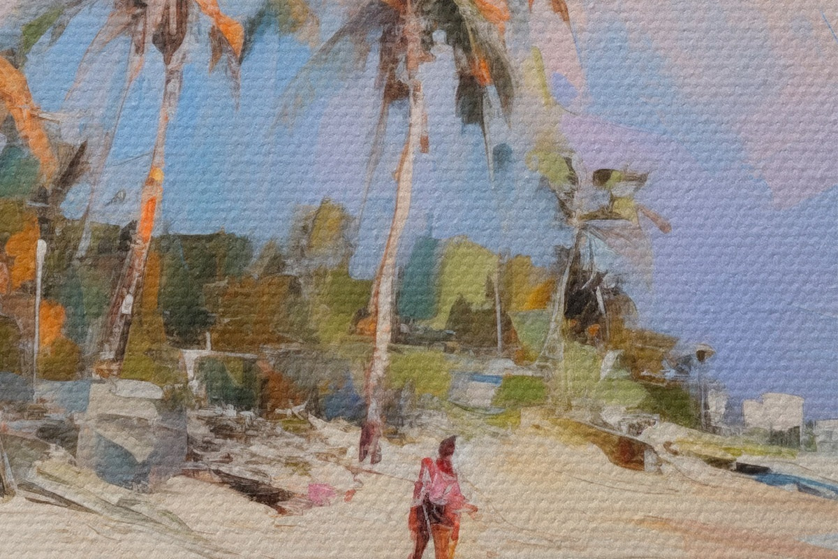 Nuotrauka Abstraktus peizažas, paplūdimys su palmių medžiais, saulėta diena su mėlynu dangumi ir keliais debesimis Nr r46284