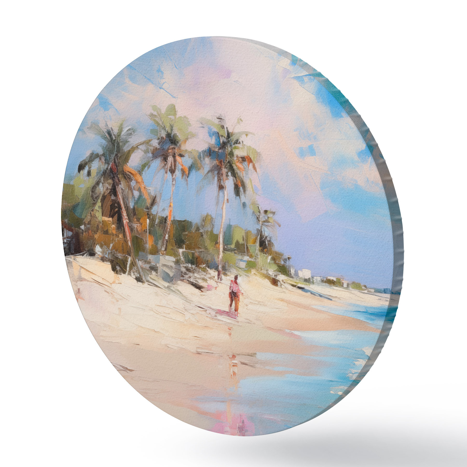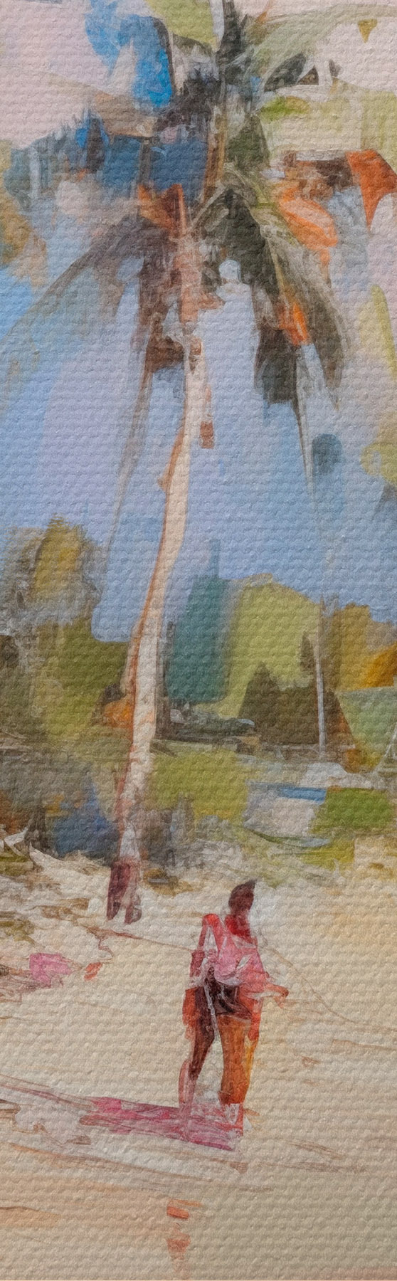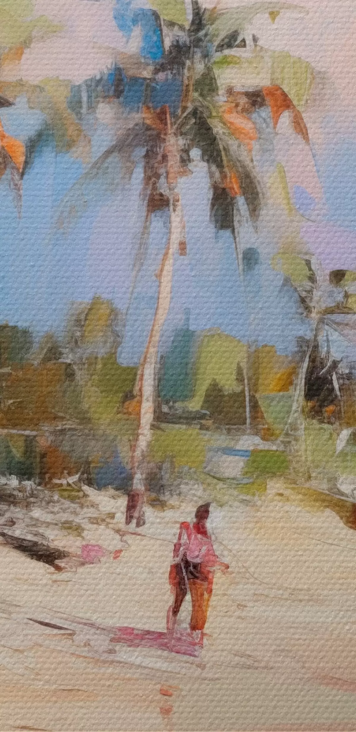 Nuotrauka Abstraktus peizažas, paplūdimys su palmių medžiais, saulėta diena su mėlynu dangumi ir keliais debesimis Nr r46284