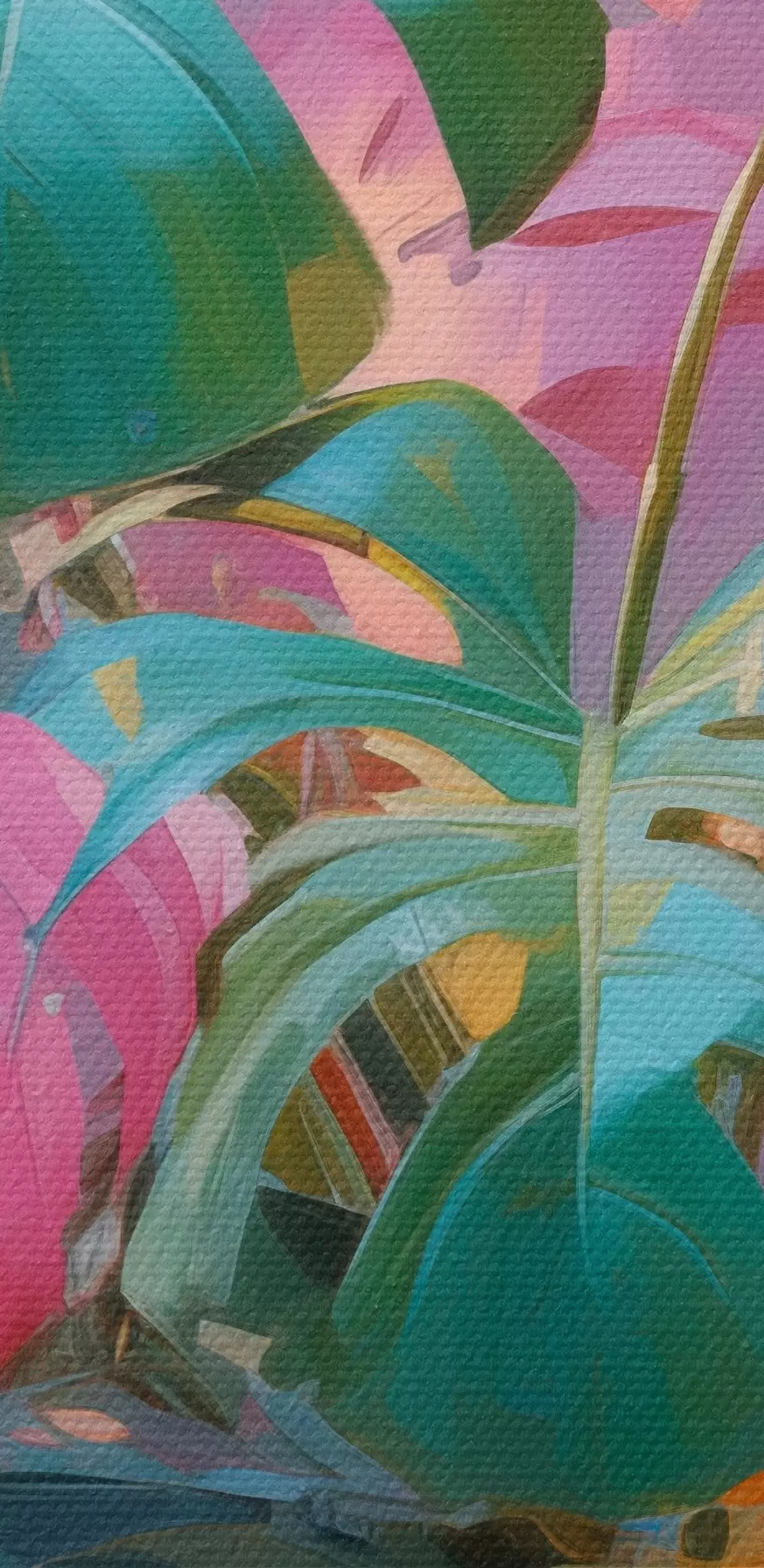 Nuotrauka Abstraktaus monstera augalo su rožiniais ir žaliais lapais, ryškiomis spalvomis, prieš neryškų foną Nr r46287