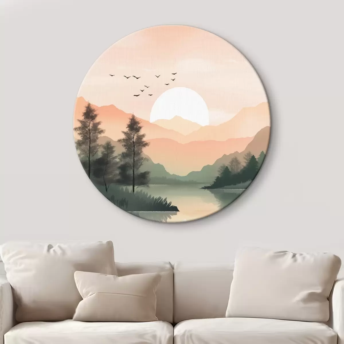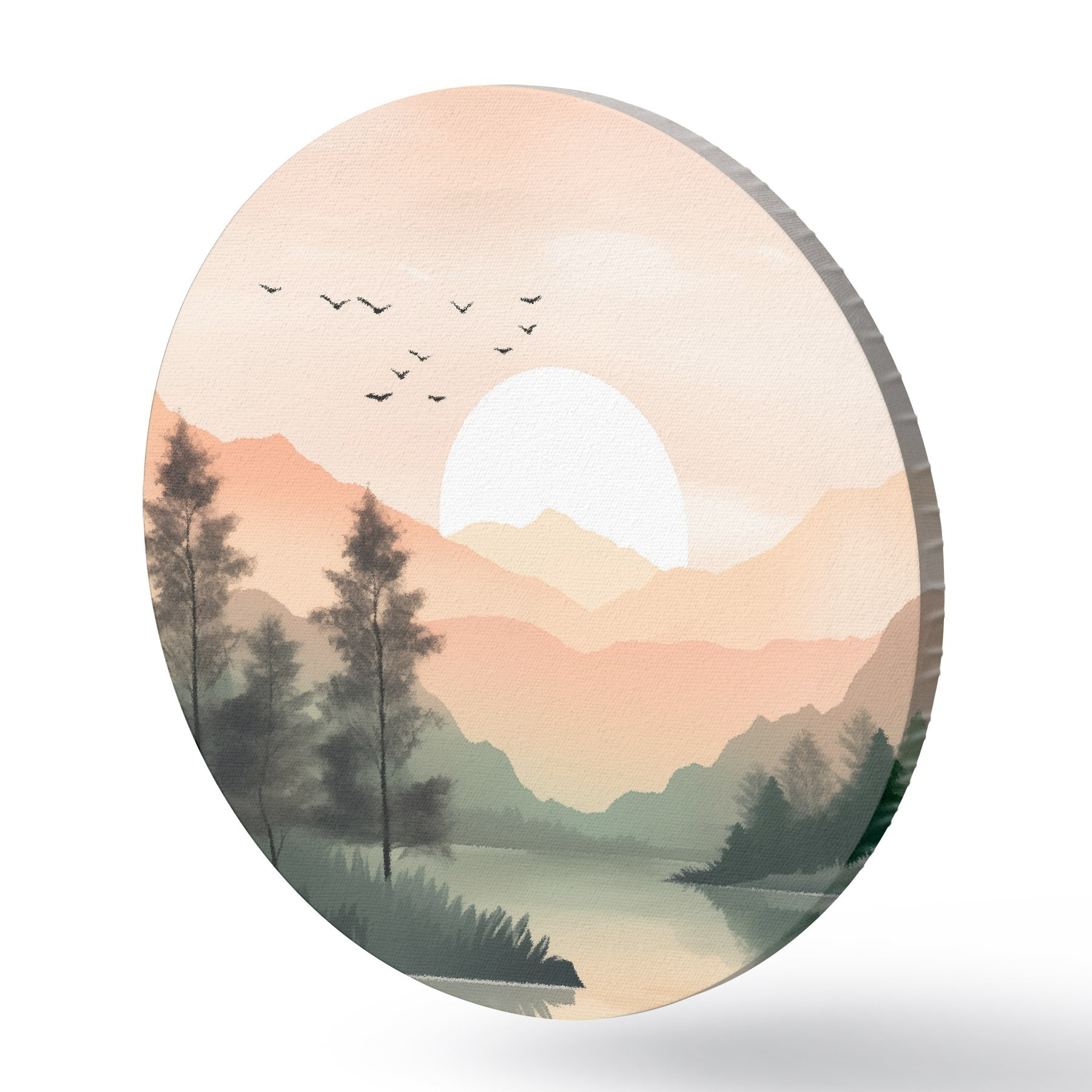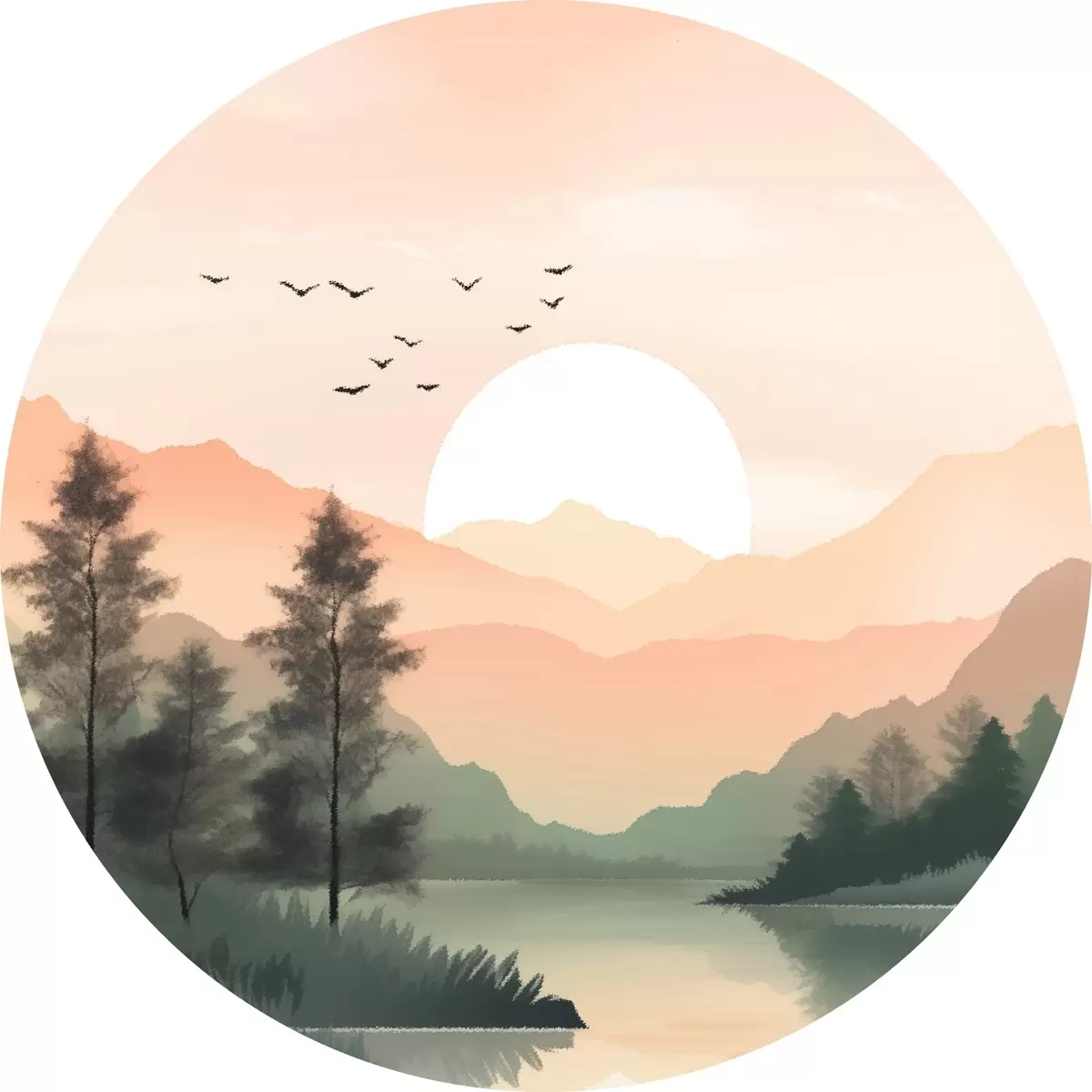Nuotrauka Pastelinė saulėlydis virš ramio ežero su tolimais kalnais ir paukščiais Nr r46508