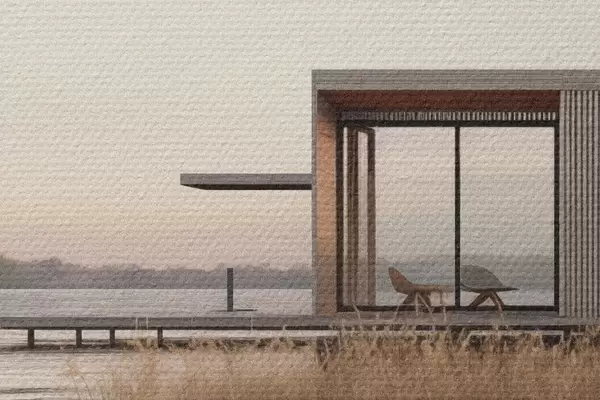 Nuotrauka Šiuolaikiška namelis prie ežero, apsuptas nendrių, švelniame sutemų šviesoje Nr r46513