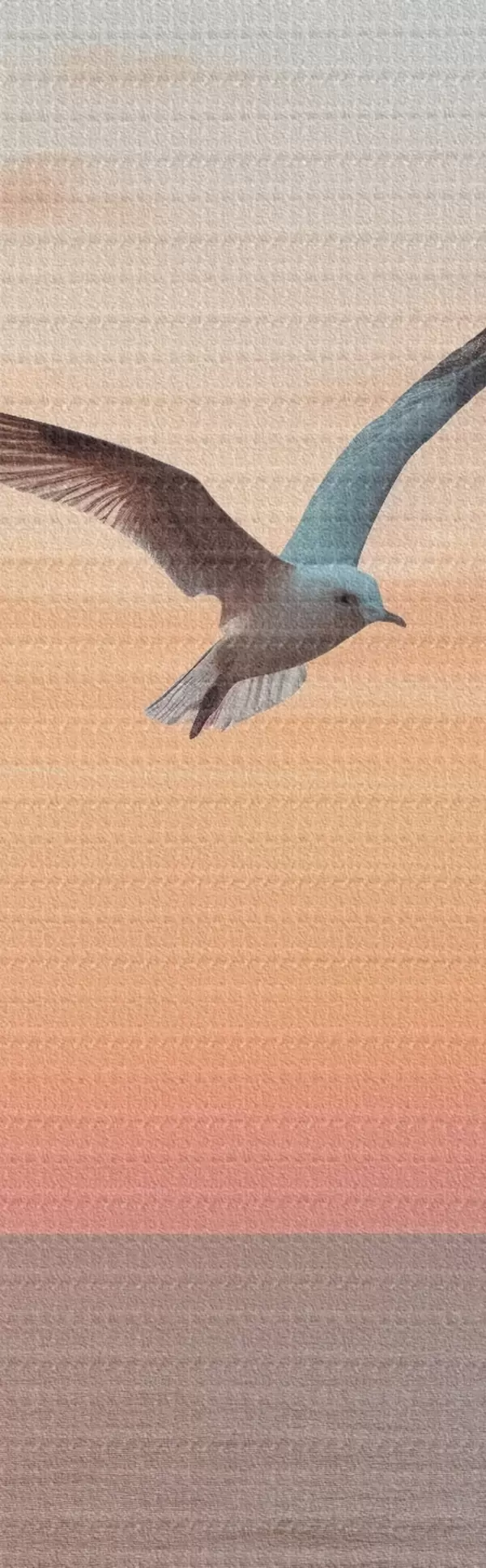 Nuotrauka Jūrinis paukštis virš jūros rausvai-persikų spalvos saulėlydžio fone Nr r46520