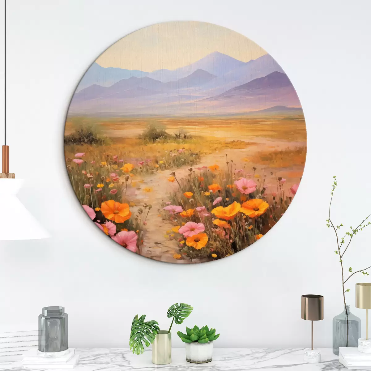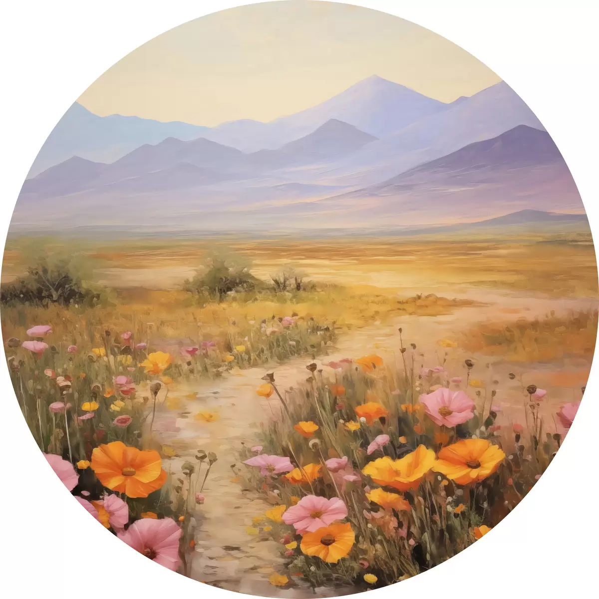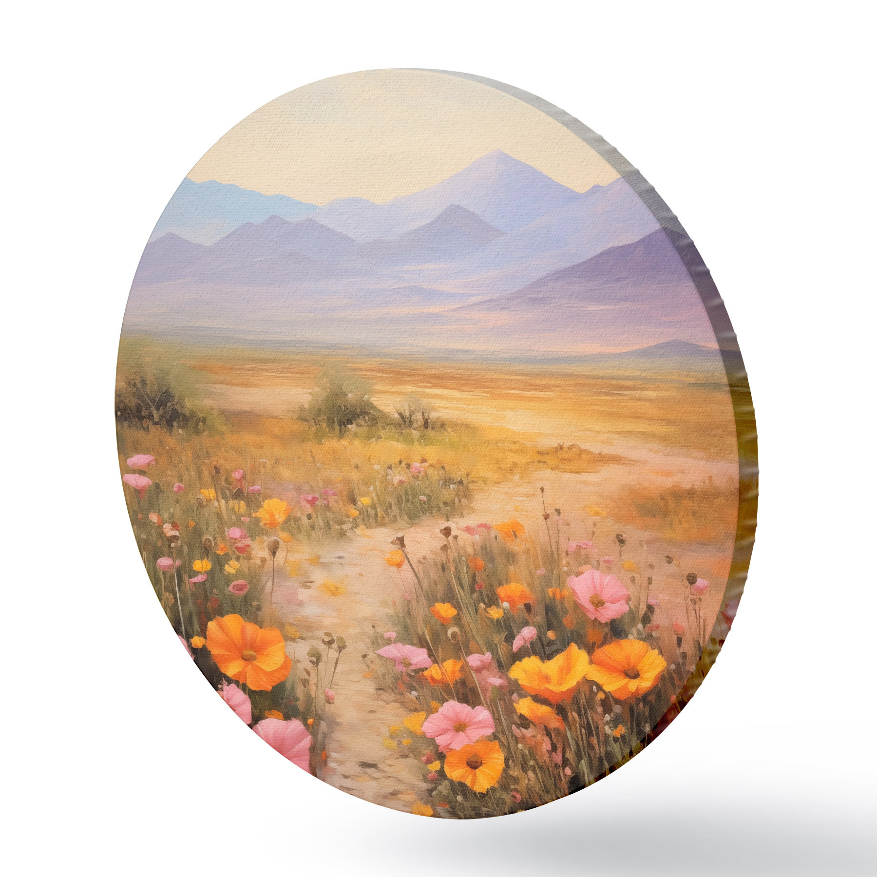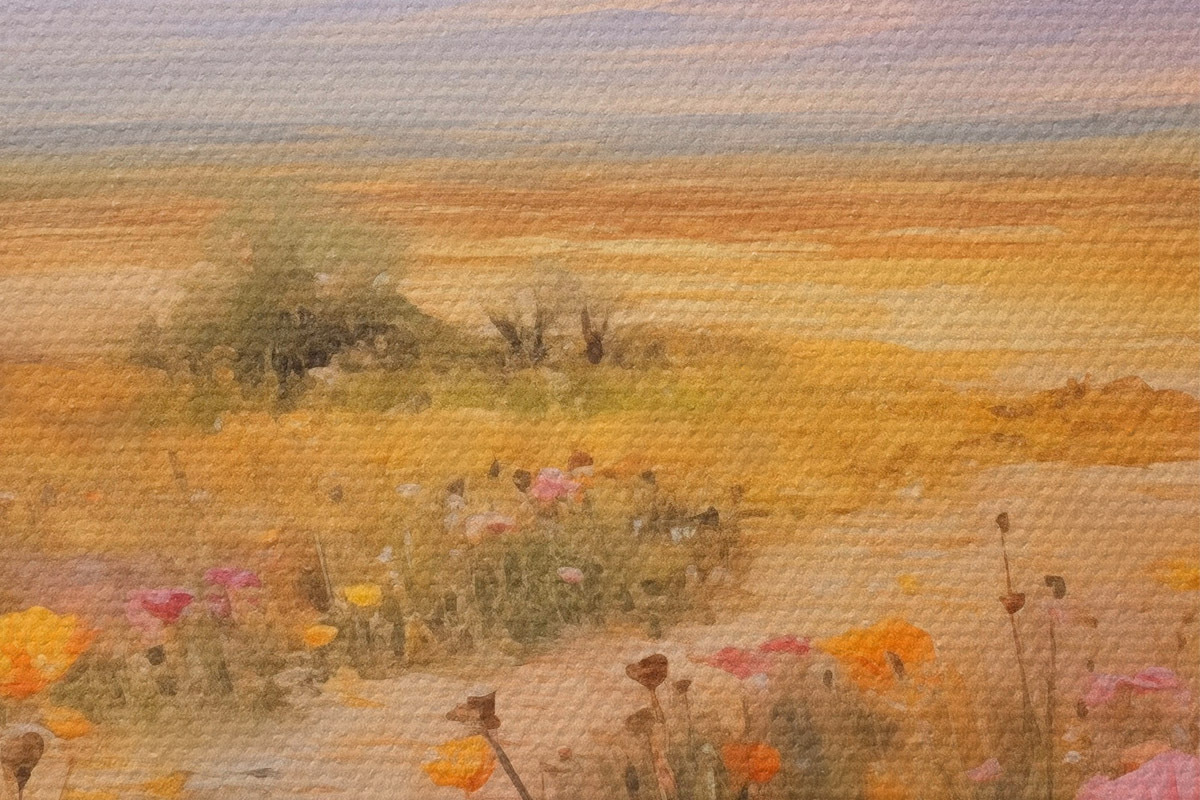 Nuotrauka Pejzažas, spalvingų gėlių laukas su kalnais fone, švelnios ir pastelinės spalvos Nr r46686
