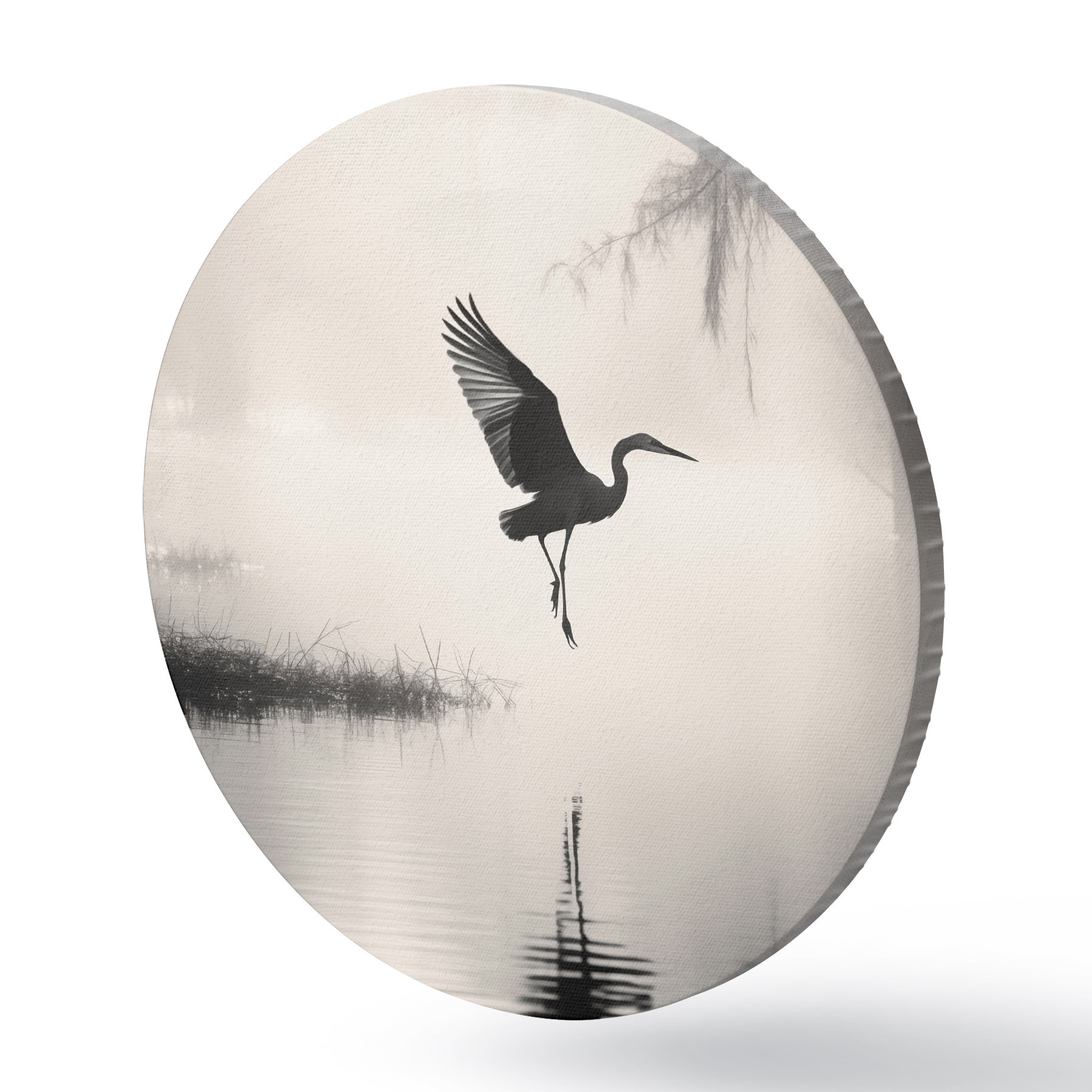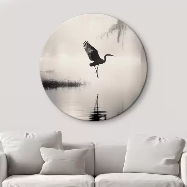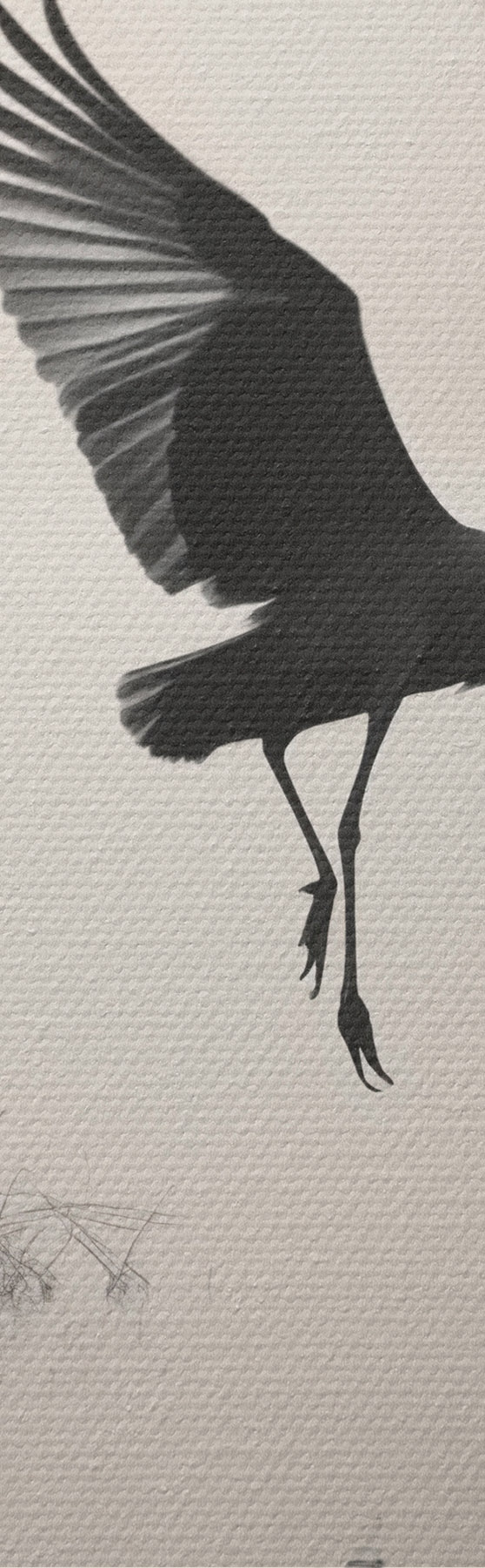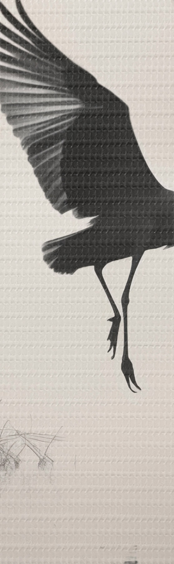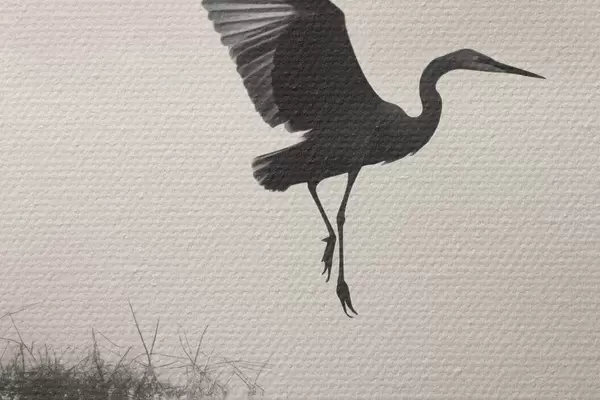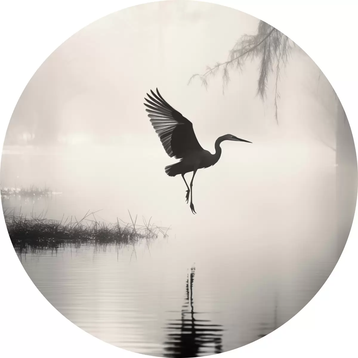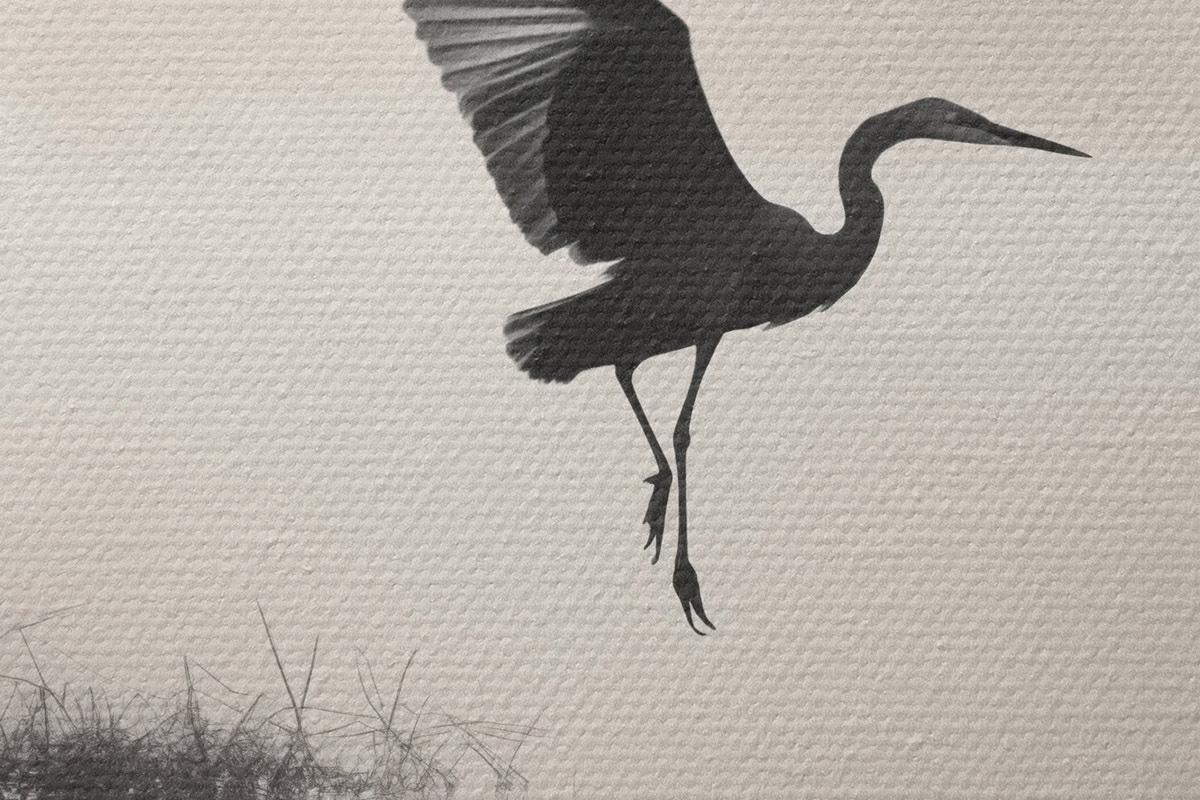 Nuotrauka Balta garza su išskleistais sparnais, skraidanti šalia aukštų nendrių, juodos ir baltos spalvų minimalistinė kompozicija Nr r46694