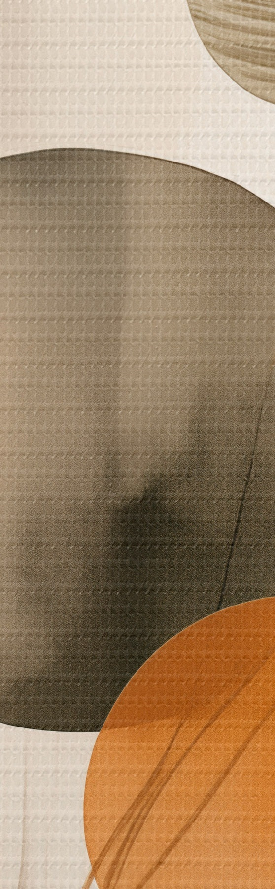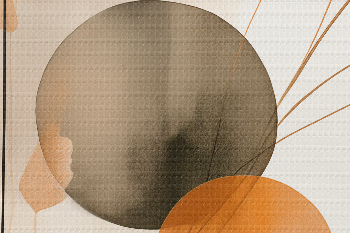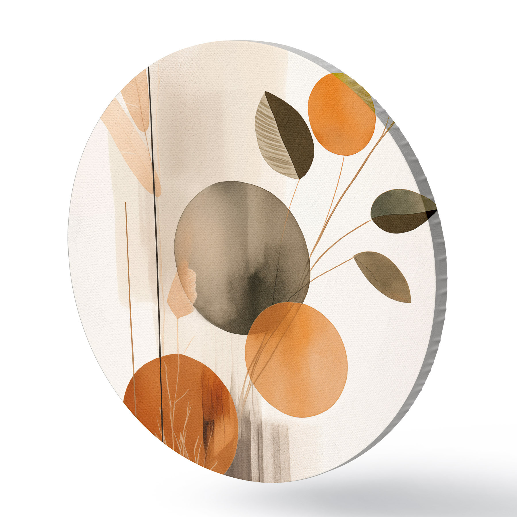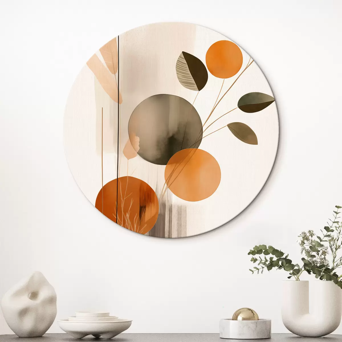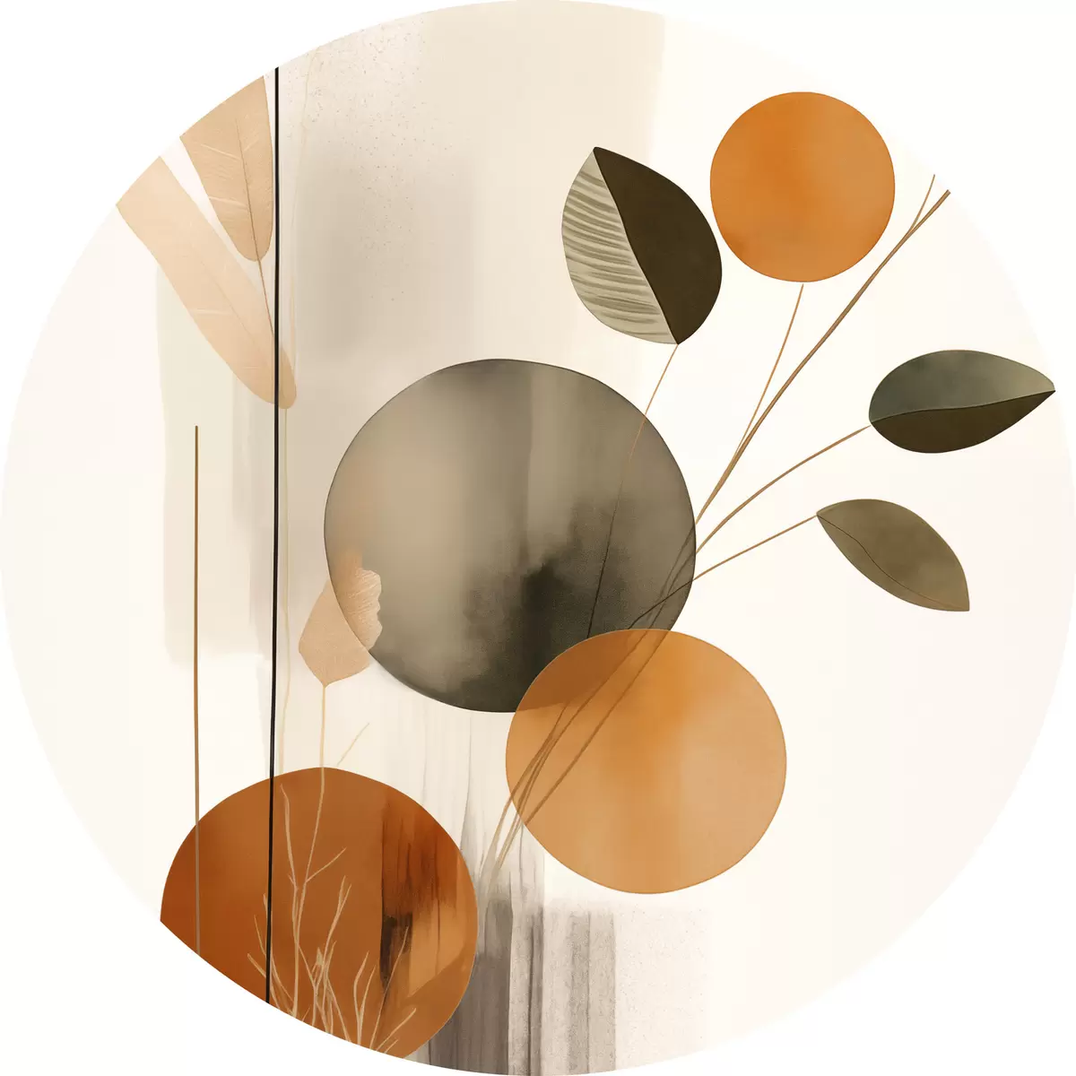 Nuotrauka Abstraktaus tapybos imitacija su oranžiniais ir pilkais apskritimais, lapais ir šakomis, modernus stilius, akvarelės efektas Nr r46697