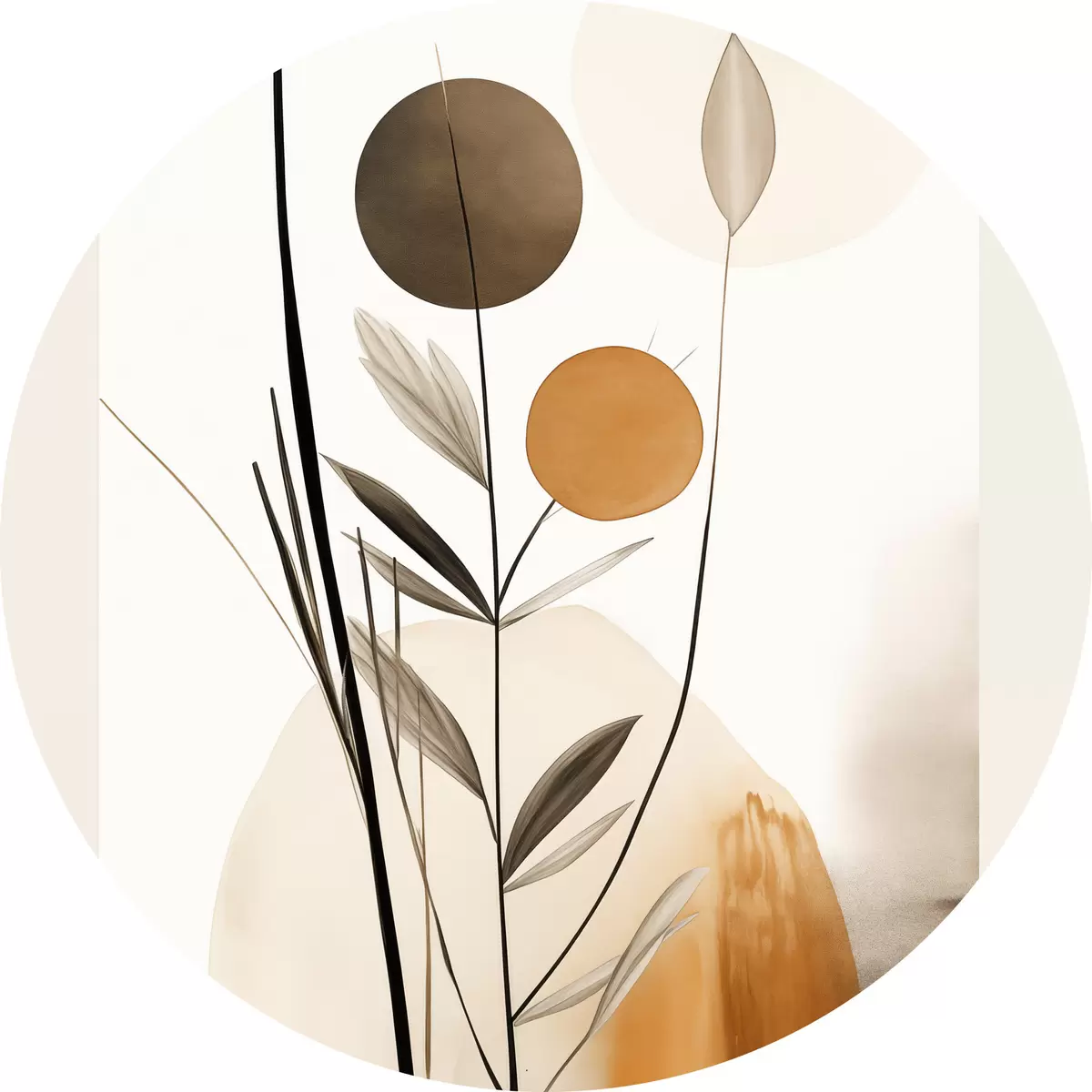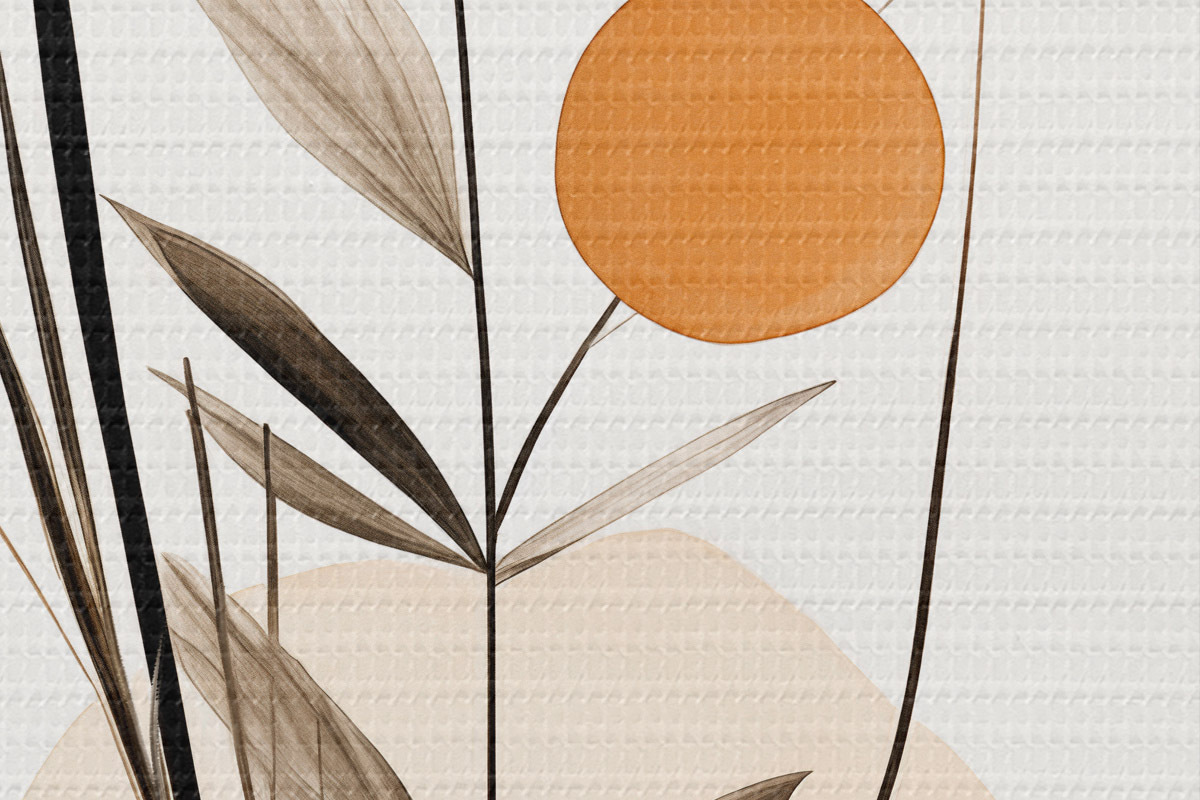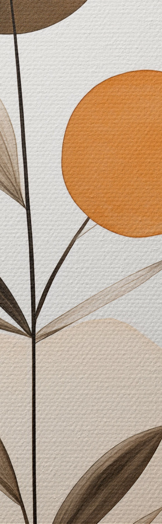 Nuotrauka Abstraktaus tapybos imitacija su oranžiniais ir pilkais apskritimais, lapais ir šakomis, modernus stilius, akvarelės efektas Nr r46698