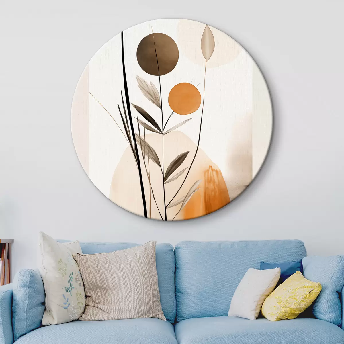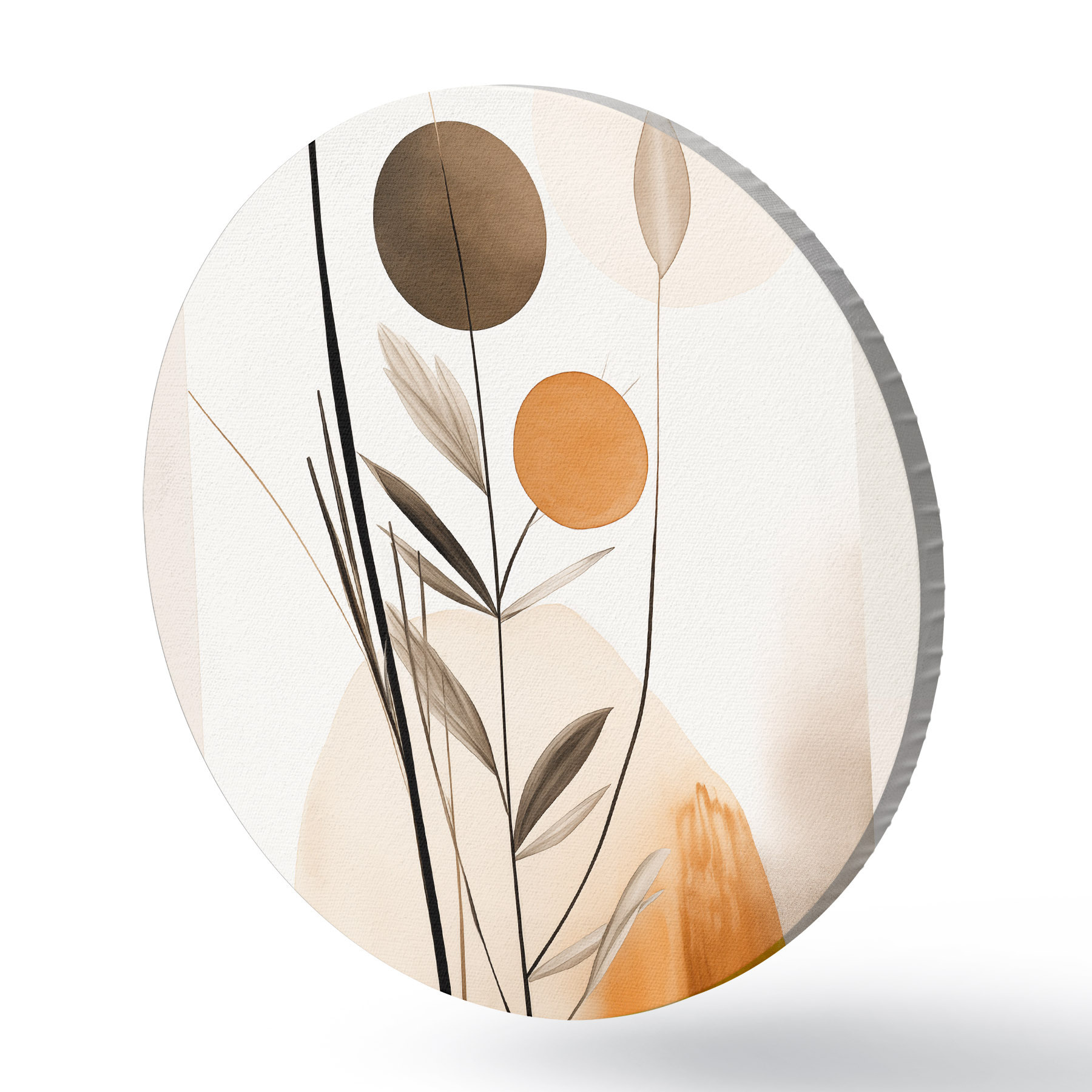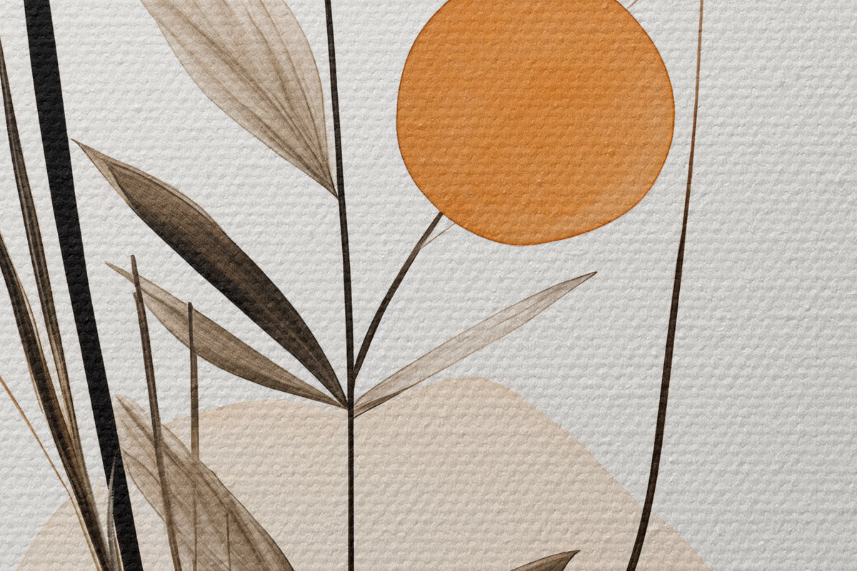 Nuotrauka Abstraktaus tapybos imitacija su oranžiniais ir pilkais apskritimais, lapais ir šakomis, modernus stilius, akvarelės efektas Nr r46698