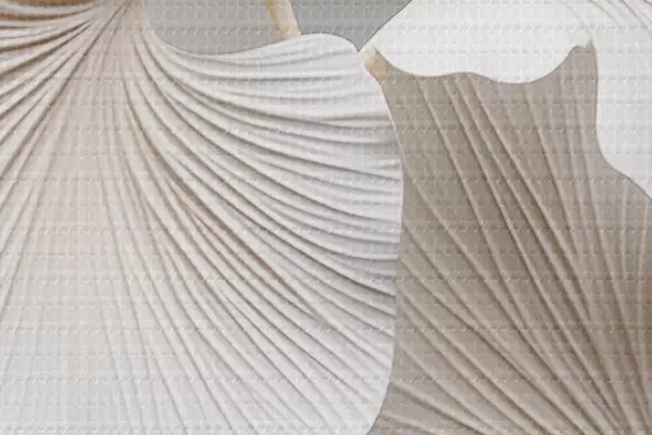 Nuotrauka Balta ginkgo biloba lapai su išsamiomis gyslomis, švelniu apšvietimu, tekstūruotu elegantišku ir minimalistiniu dizainu Nr r46705