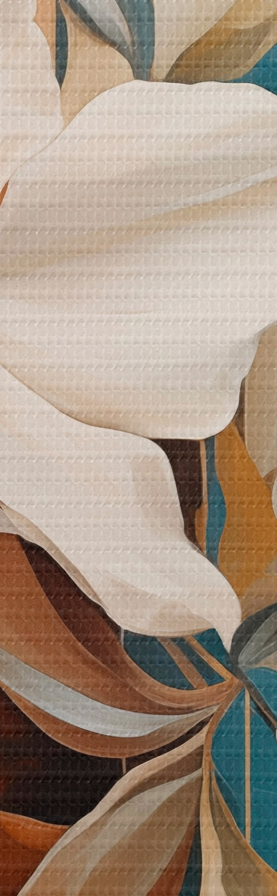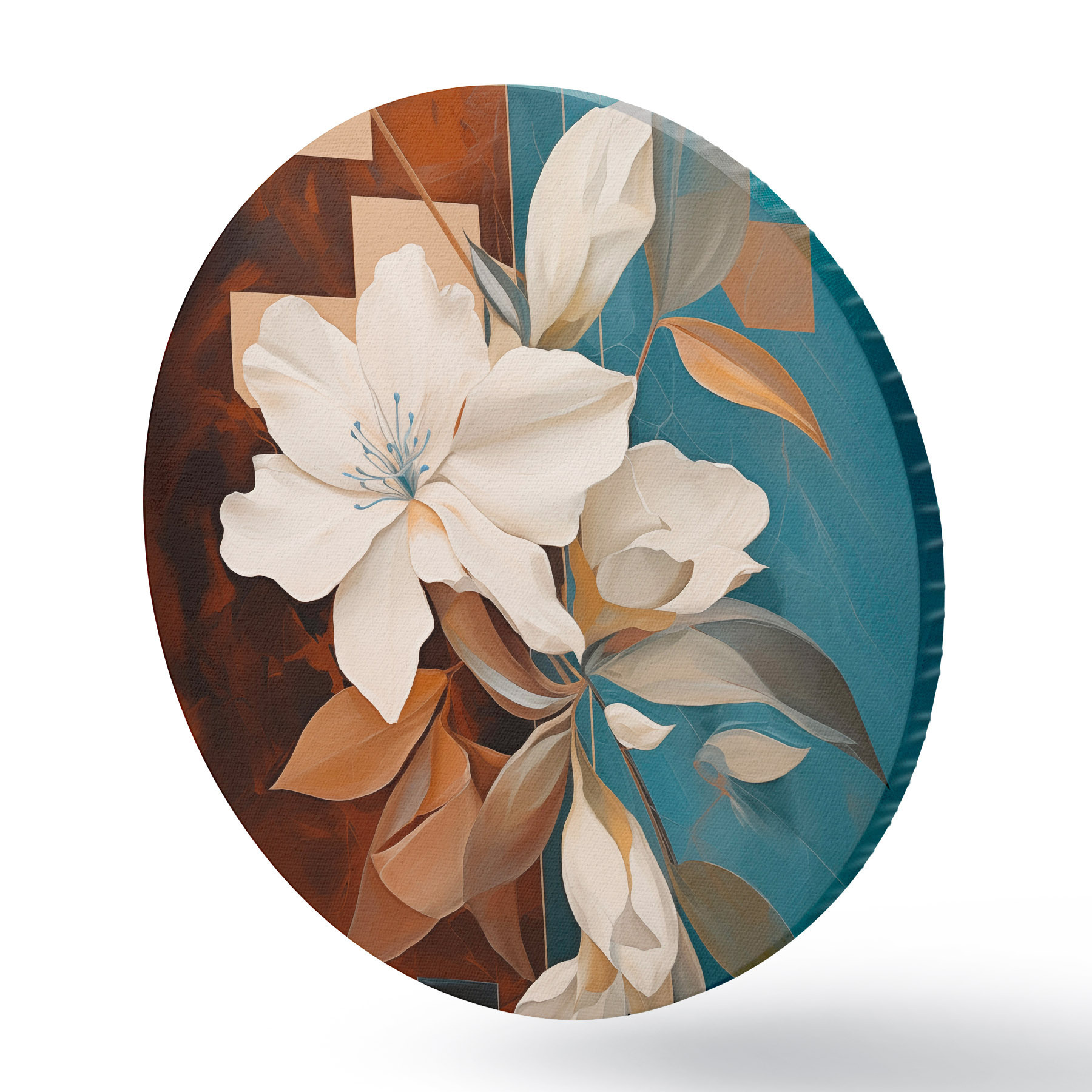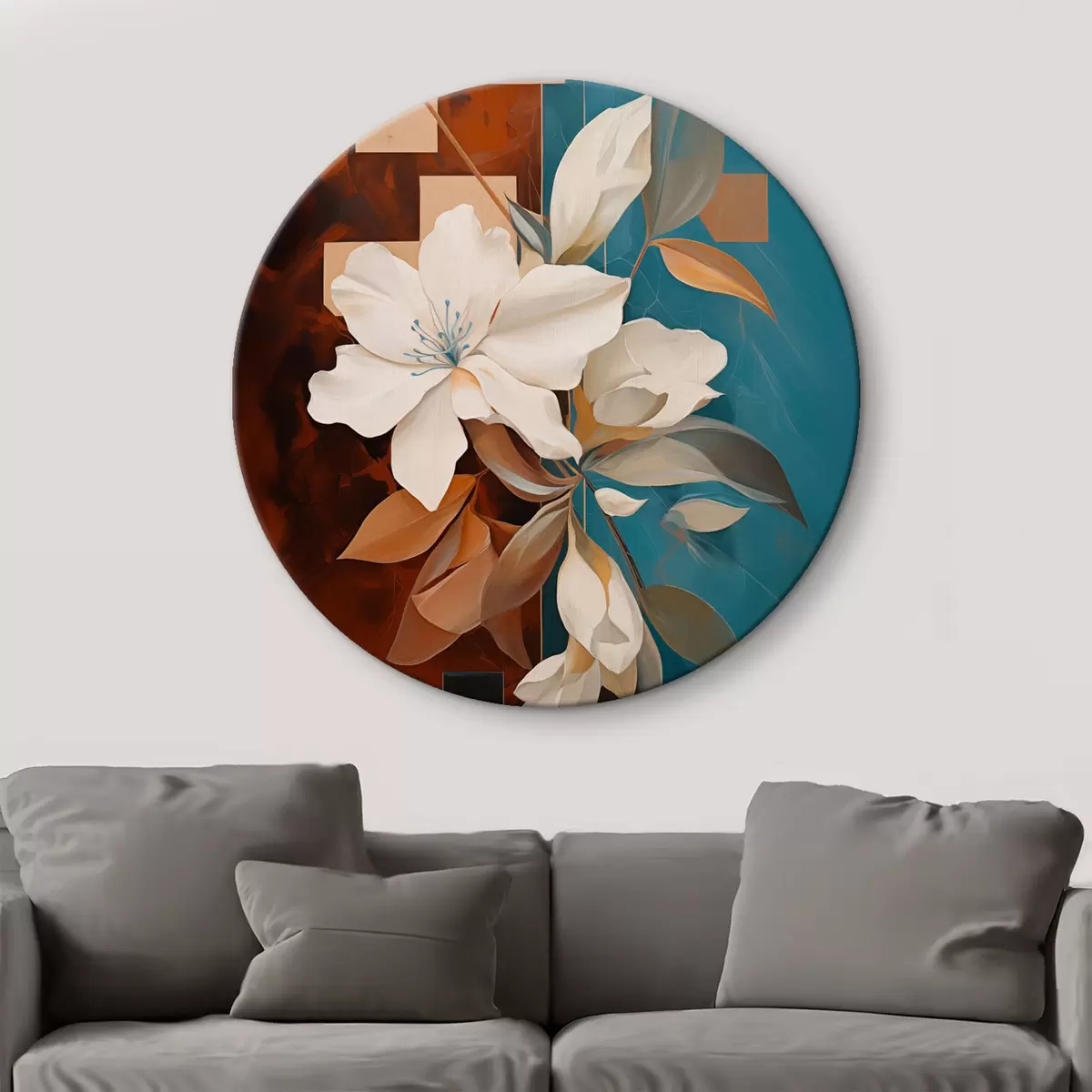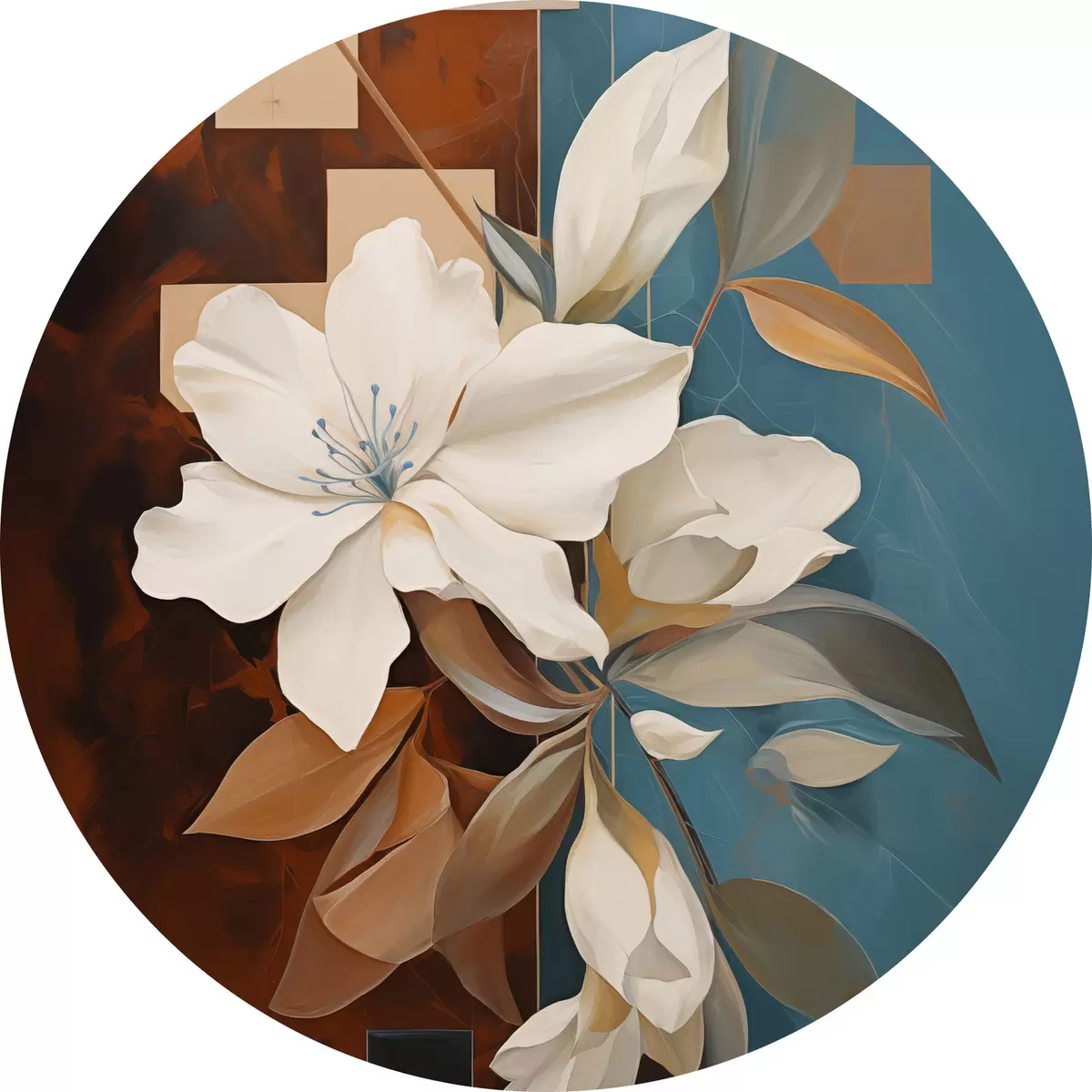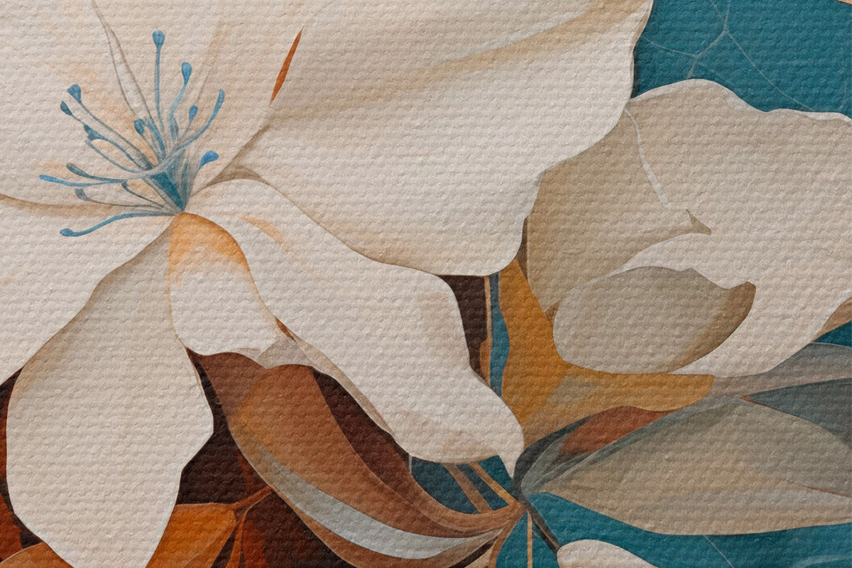 Nuotrauka Abstrakčios baltos gėlės ir lapai su rudos ir mėlynos spalvos fonu su abstrakčiomis formomis, minimalistiniu stiliumi. Nr r46709
