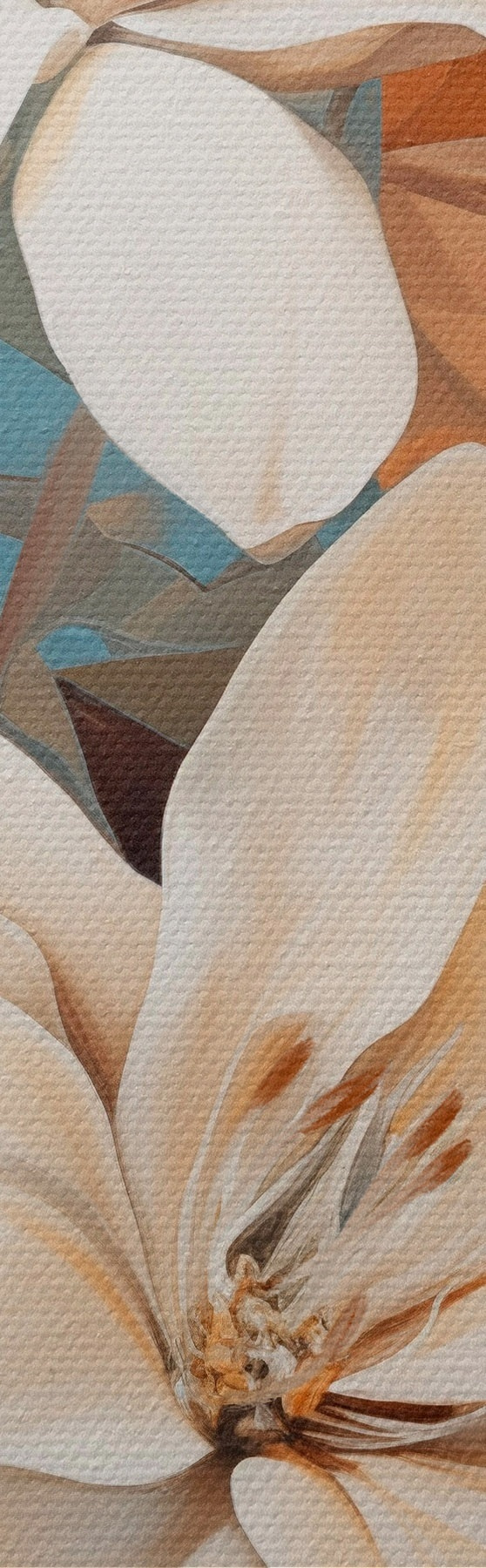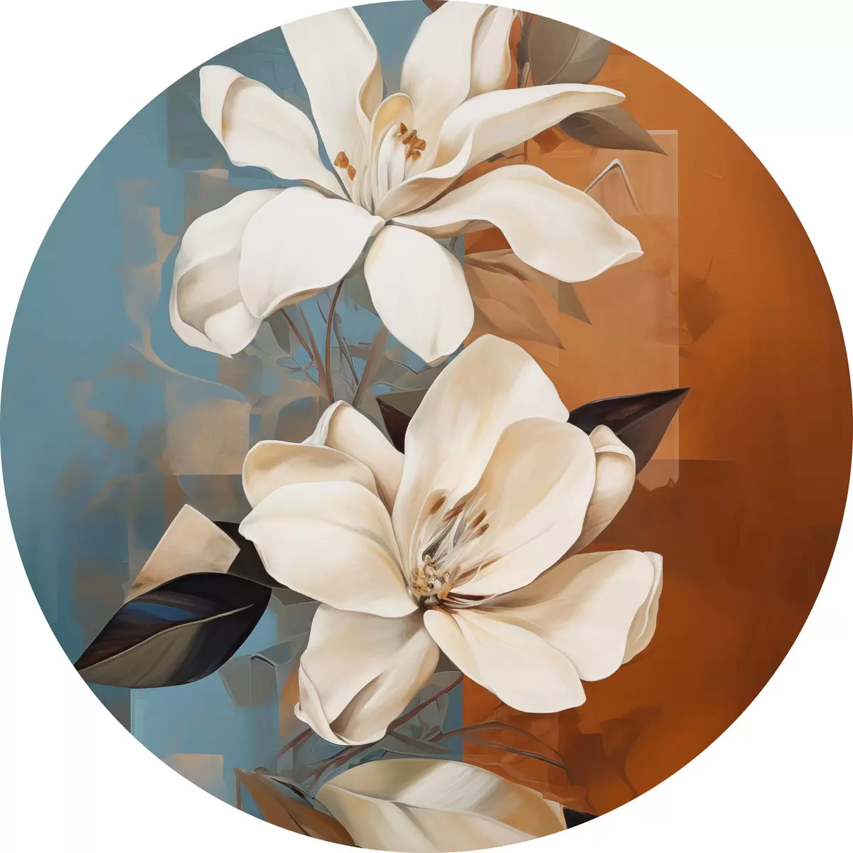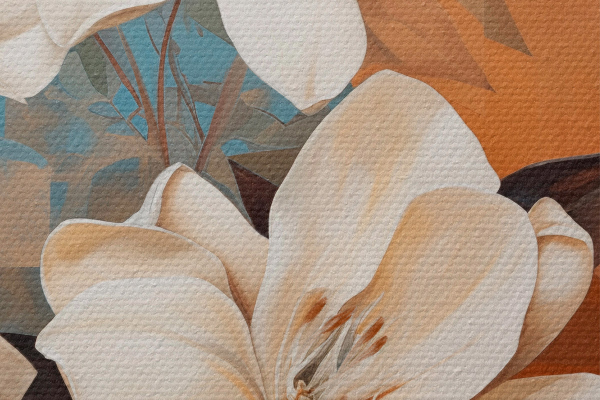 Nuotrauka Abstrakčios baltos gėlės ir lapai su rudos ir mėlynos spalvos fonu su abstrakčiomis formomis, minimalistiniu stiliumi. Nr r46710