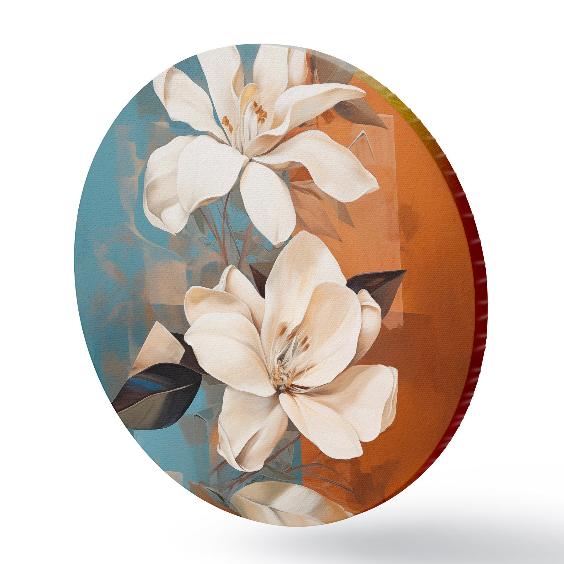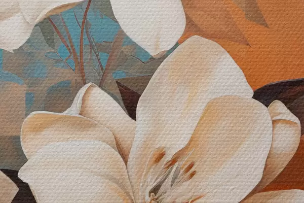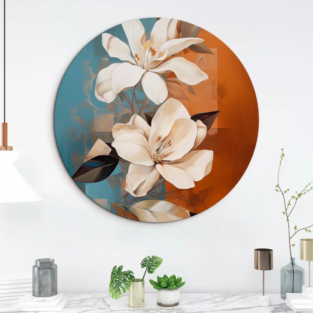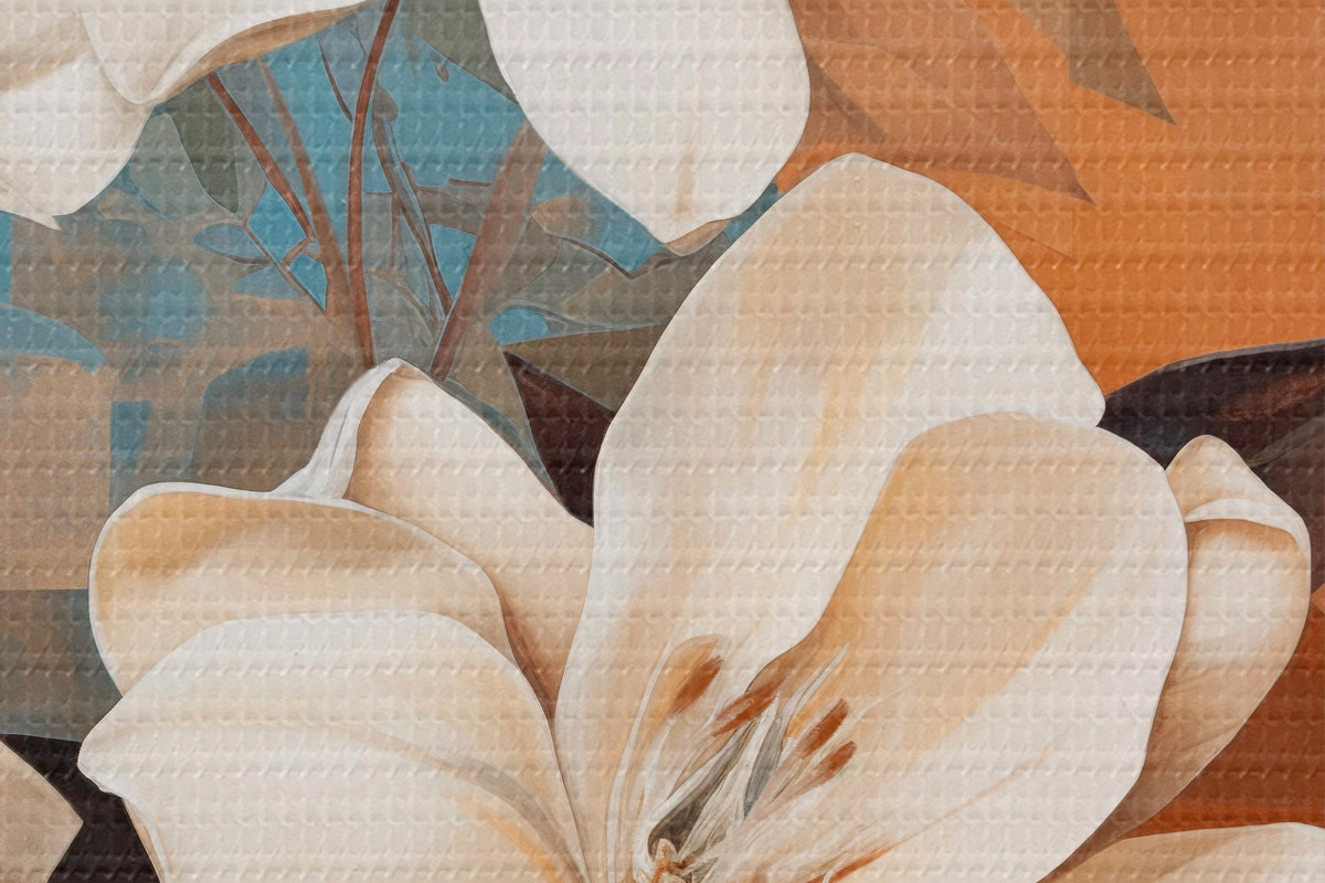 Nuotrauka Abstrakčios baltos gėlės ir lapai su rudos ir mėlynos spalvos fonu su abstrakčiomis formomis, minimalistiniu stiliumi. Nr r46710