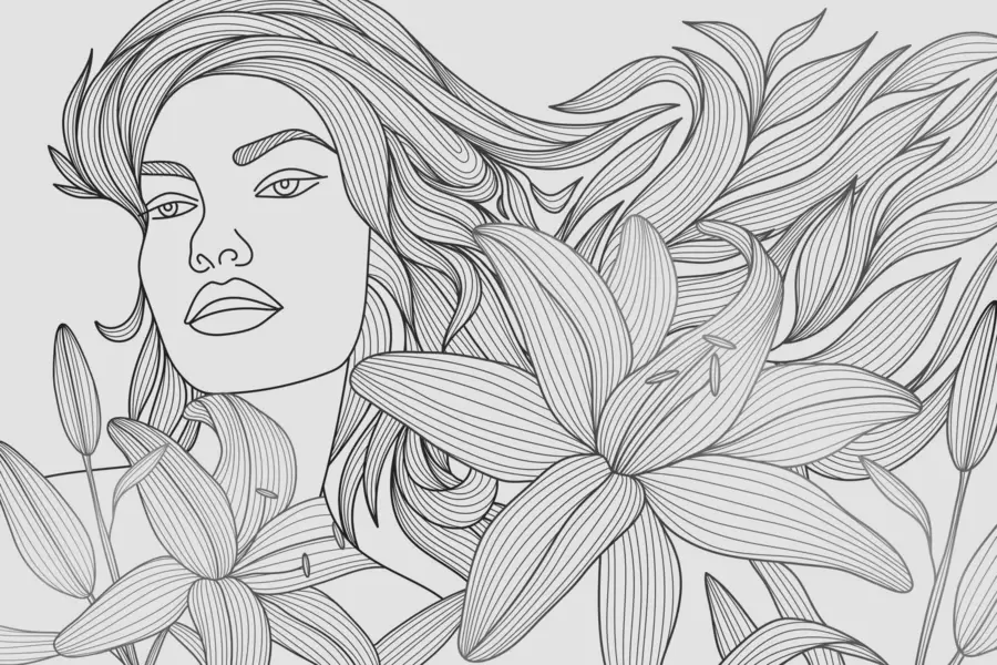 Minimalistinė abstrakcija su organinėmis formomis, stilizuotomis medžių šakomis ar augalais su subtiliomis gėlių detalėmis