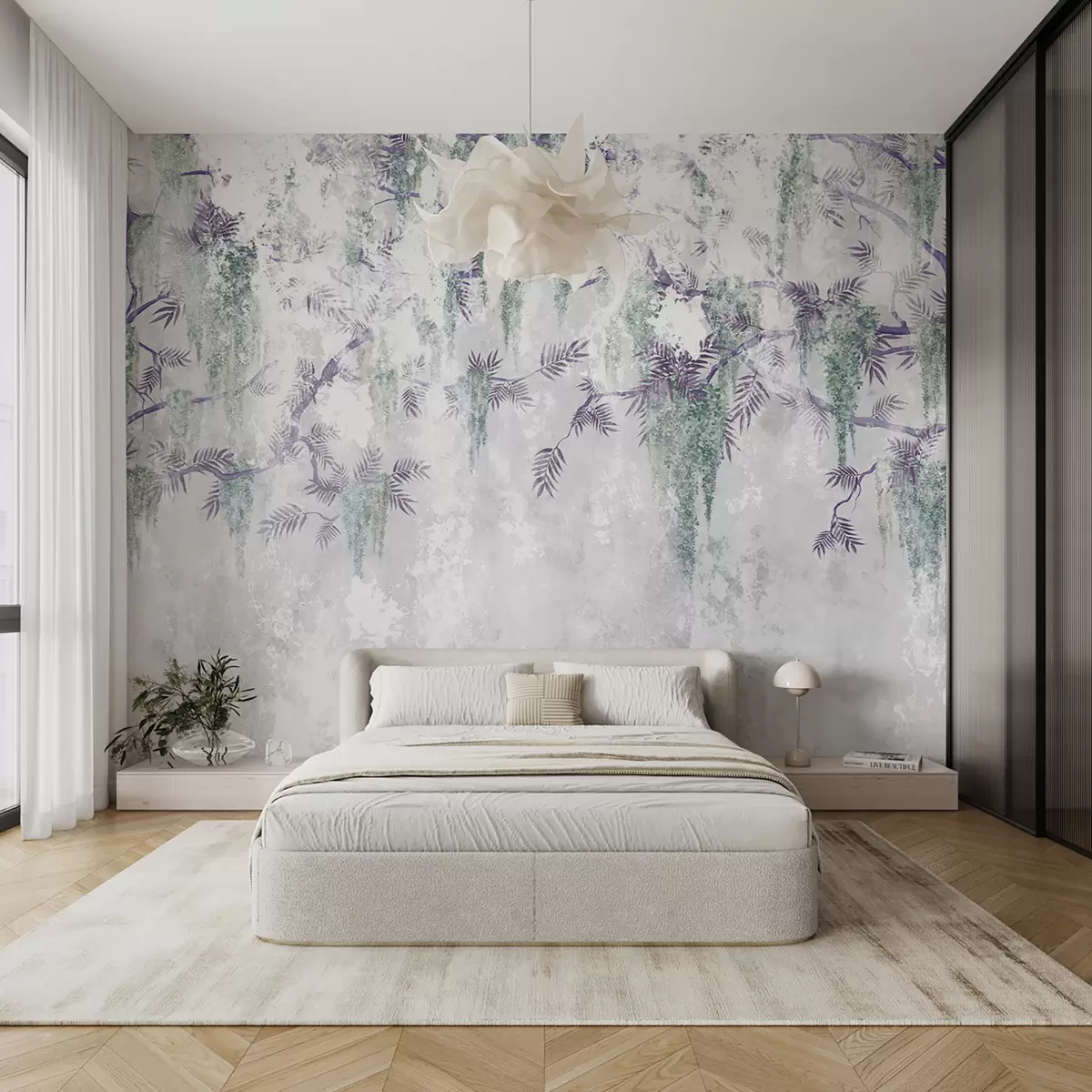 Fototapetai Kabančios madingos grunge šakos su violetinėmis mėlynomis gėlėmis Nr. u73816v1