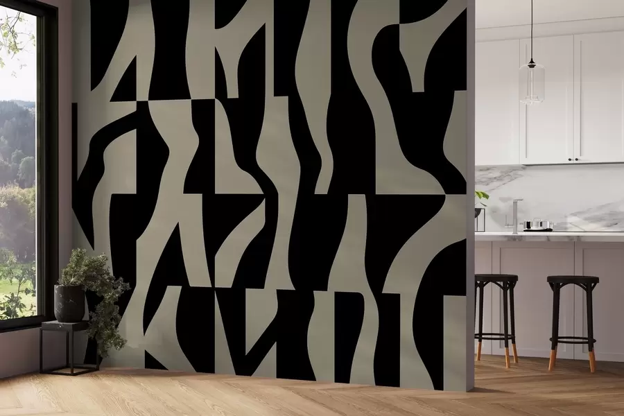 Abstrakti skystos tekstūros tapyba juodos, baltos, pilkos ir smėlio spalvos marmuro imitacijos atspalviais