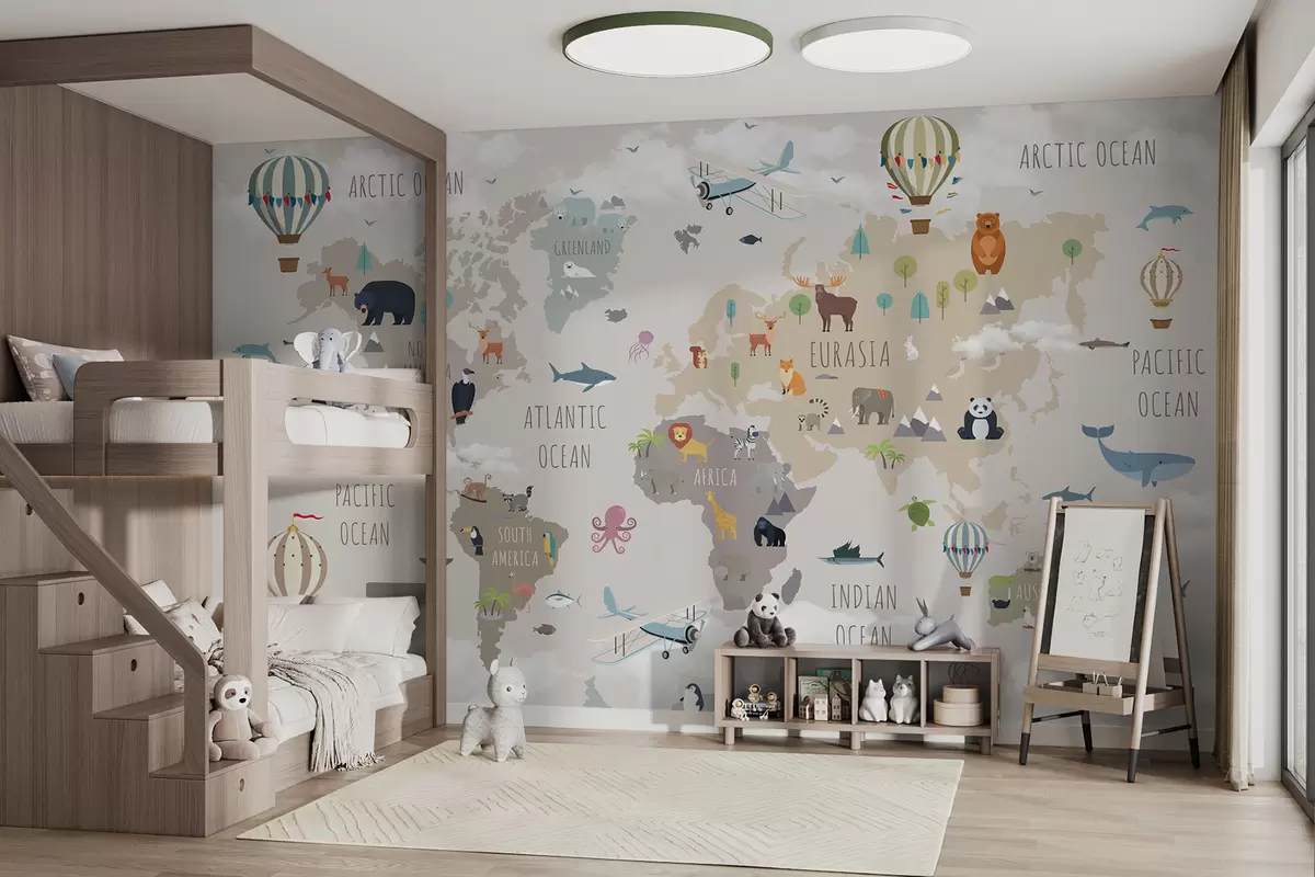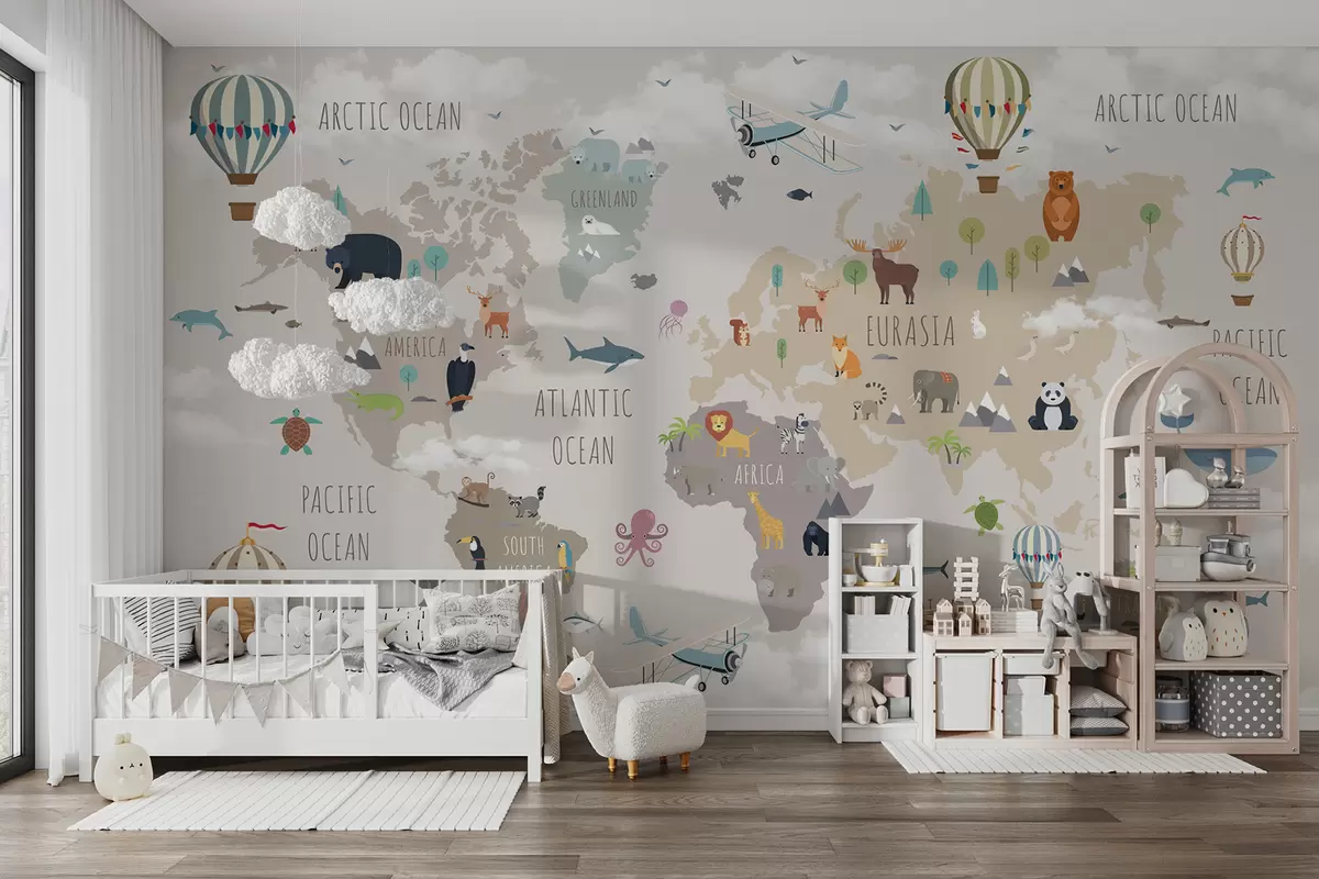 Fototapetai Pasaulio žemėlapis su gyvūnais ir balionais Nr. u96461