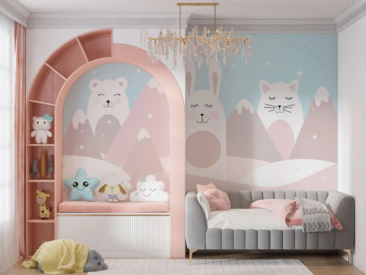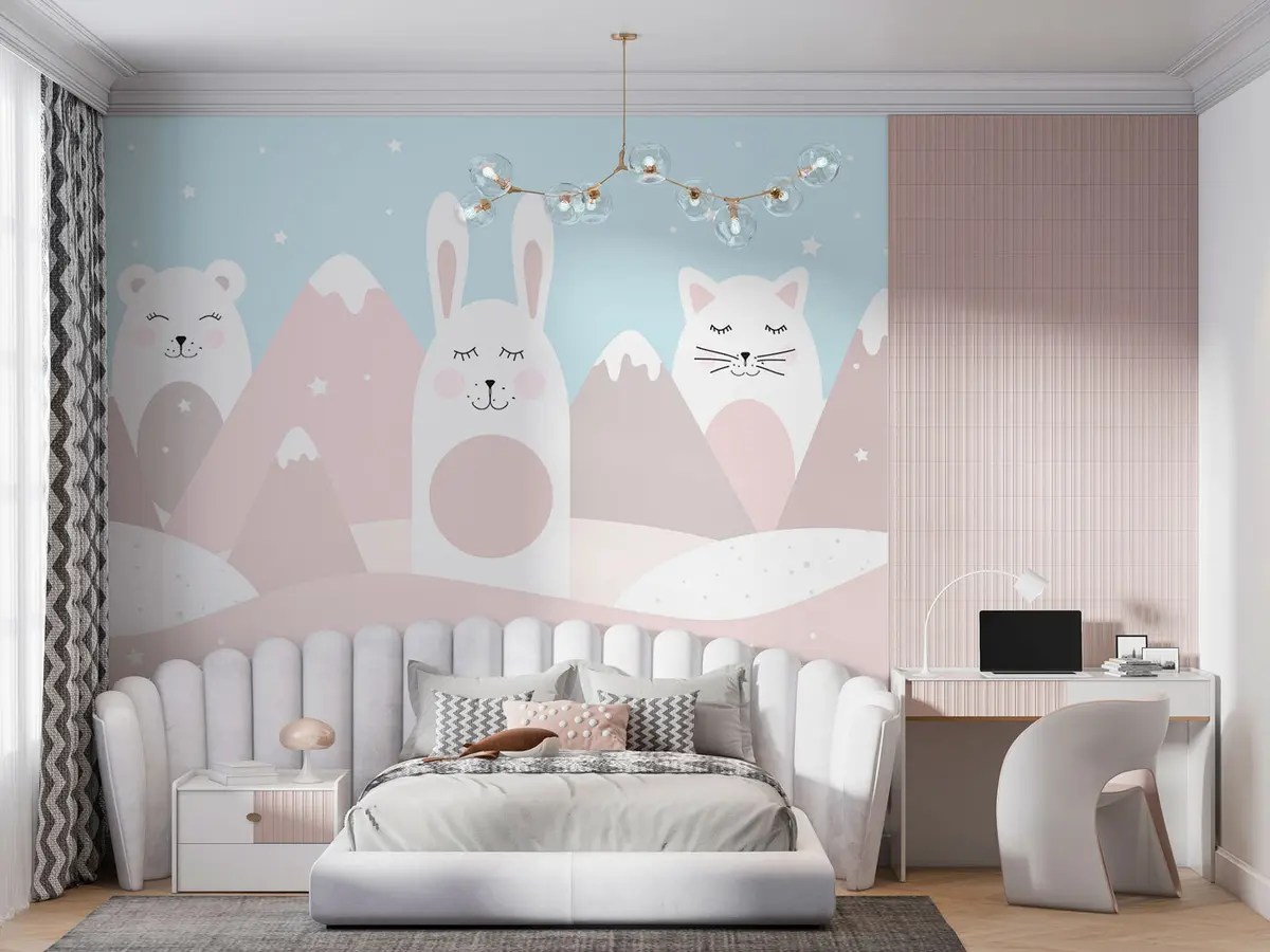 Fototapetai Triušis, lokys, lapė smėlio spalvos snieguotų kalnų fone Nr. u98135