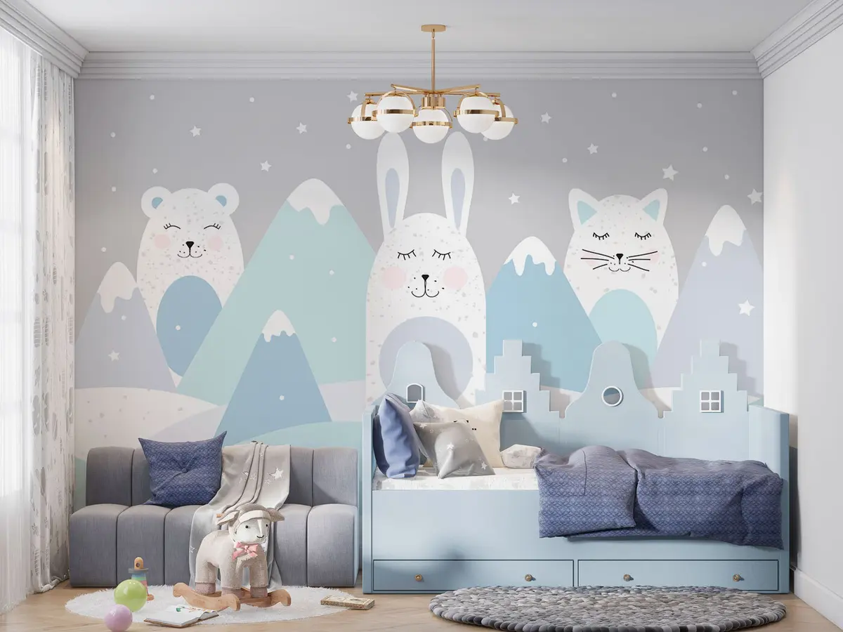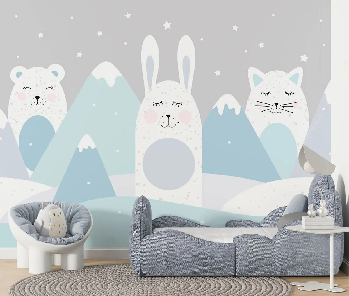 Fototapetai Triušis, lokys, lapė smėlio spalvos snieguotų kalnų fone Nr. u98135v1