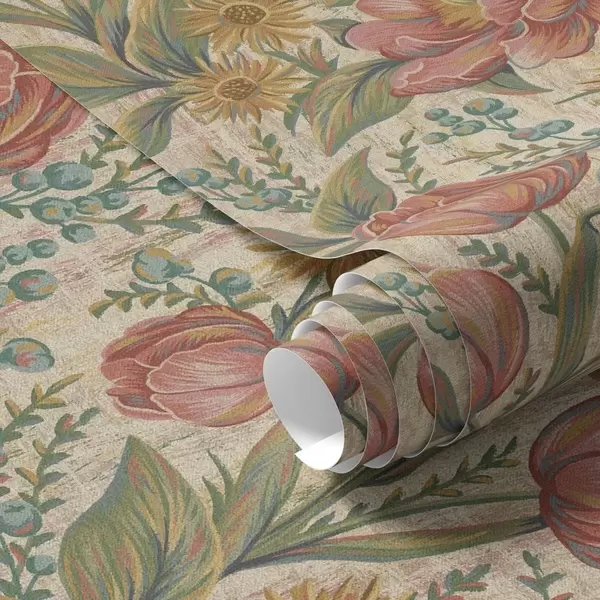 Tapetai Vintage tulipai ir astros, tekstūruotas kreminis fonas a00773