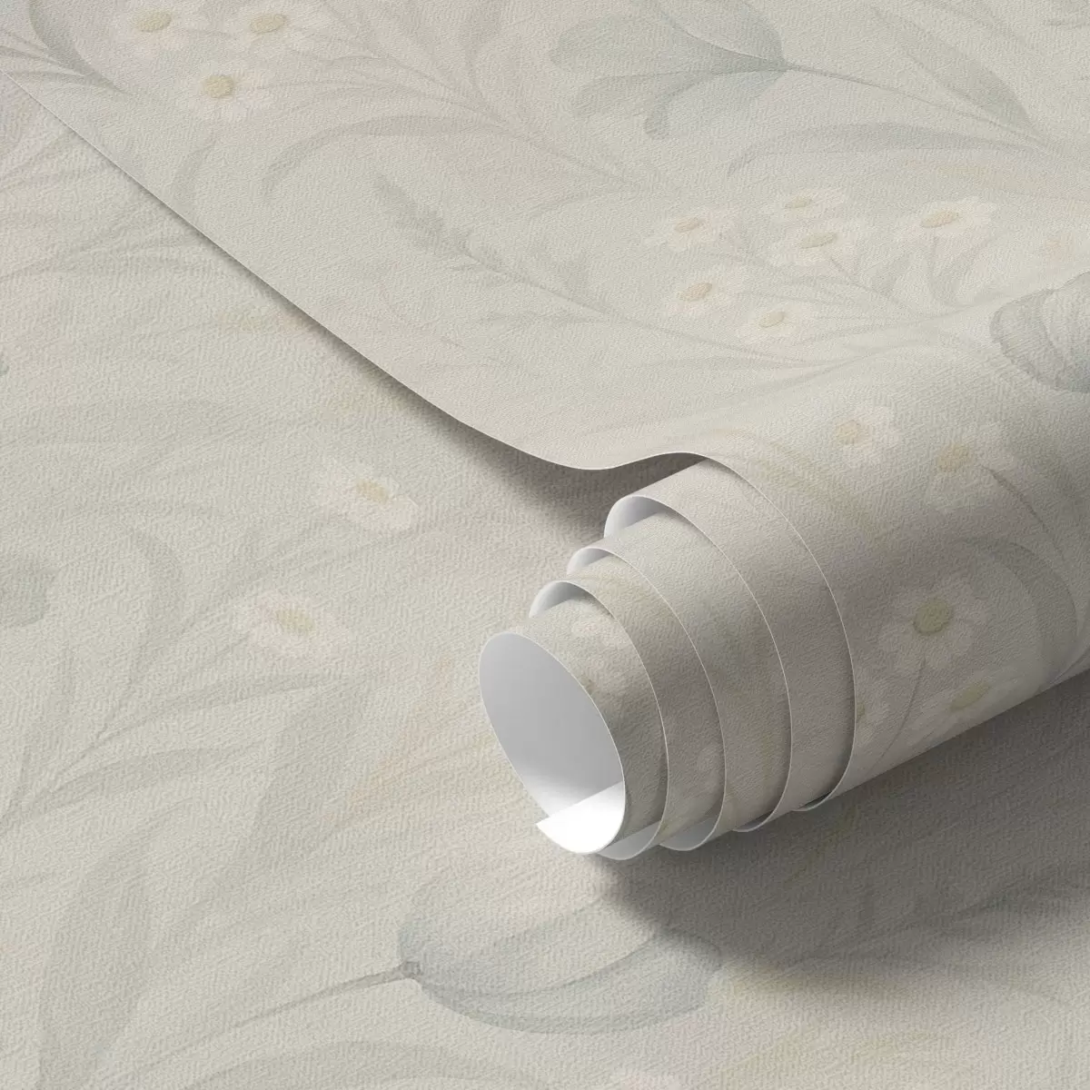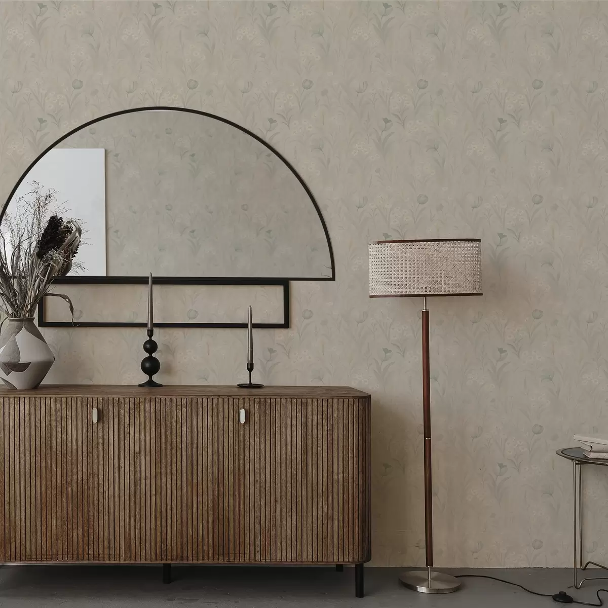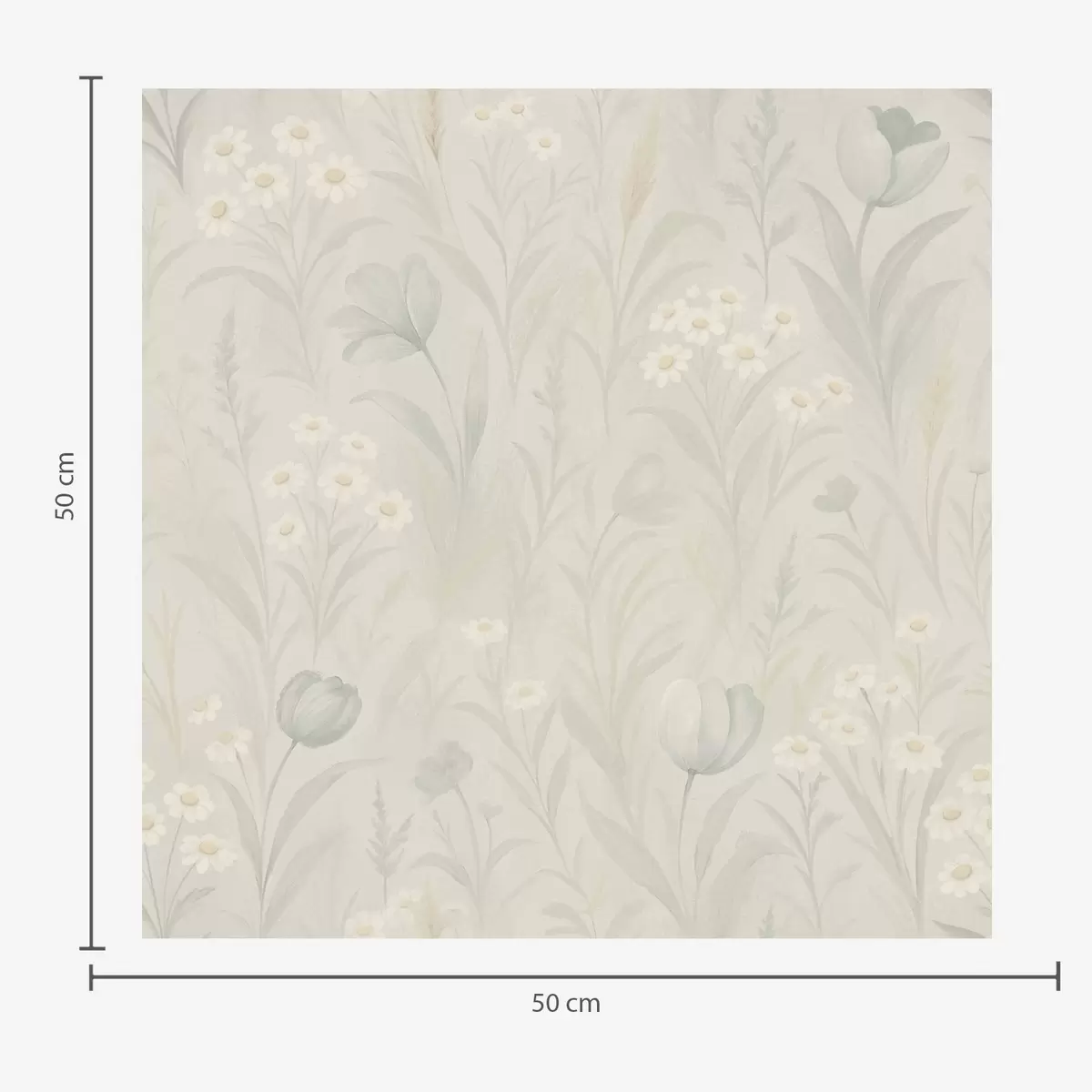 Tapetai Švelni pieva su tulpėmis ir saulėgrąžomis, pastelinės šalavijų spalvos Nr. a00779