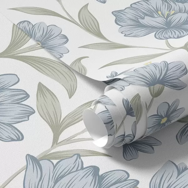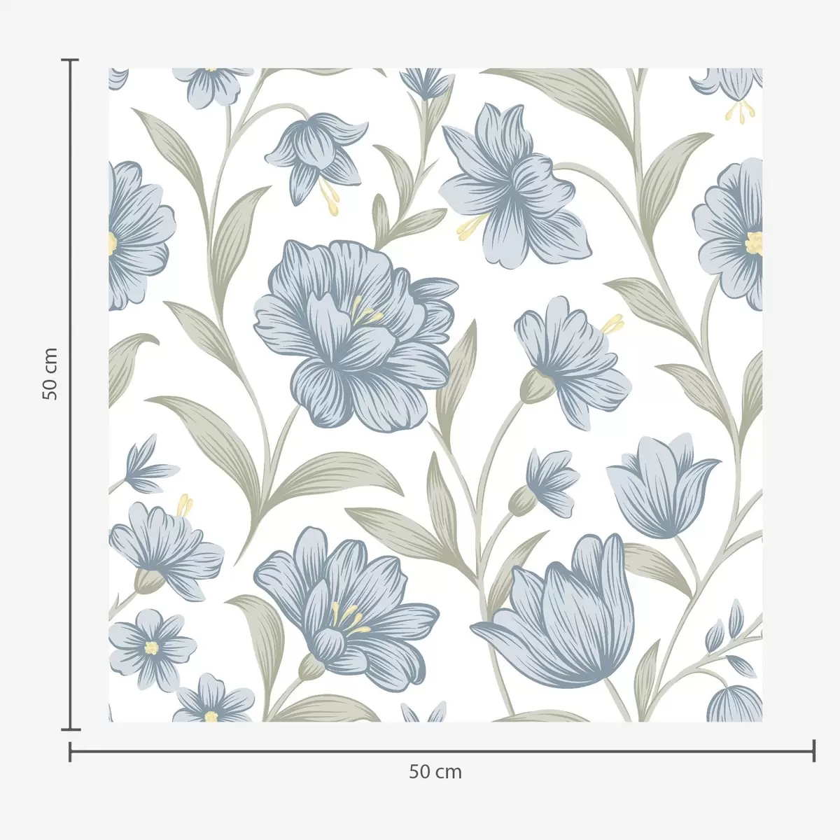 Tapetai Dulkėti mėlyni žiedai su alyvuogių lapais ant balto fono Nr. a00780