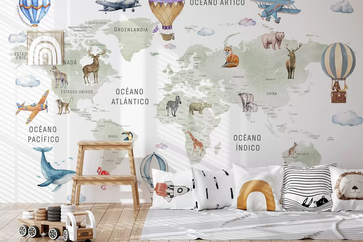 Fototapetai Vaikų žemėlapis akvarelės stiliumi su gyvūnais ir oro balionais. Ispanų kalba. Žalia spalva. Nr. c00001es
