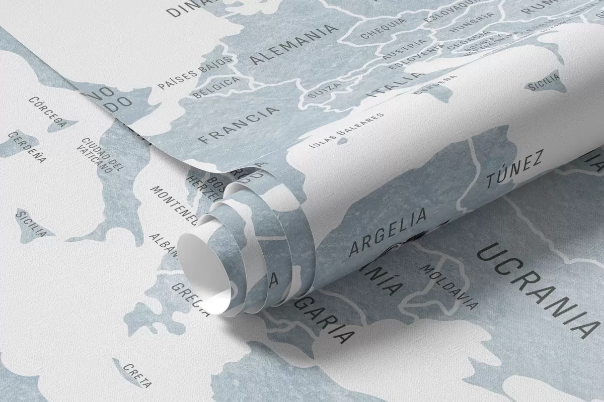 Fototapetai Vaikų žemėlapis akvarelės stiliumi su gyvūnais ir oro balionais. Ispanų kalba. Mėlyna spalva. Nr. c00001esv1
