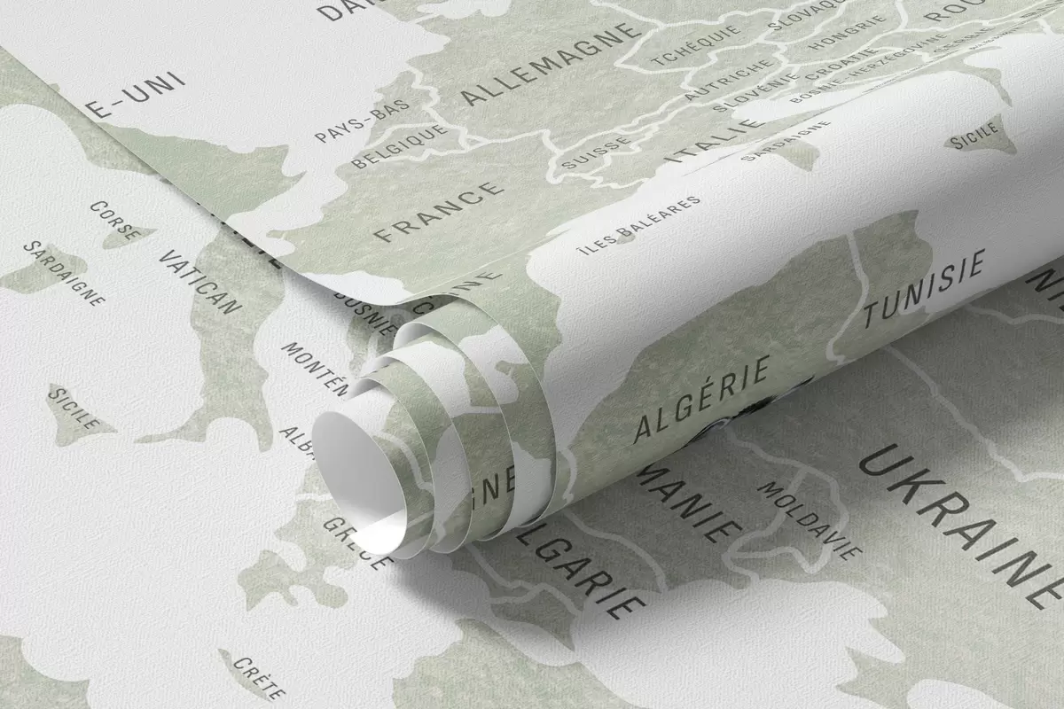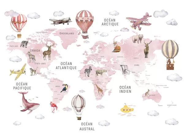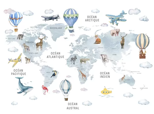 Fototapetai Vaikų žemėlapis akvarelės stiliumi su gyvūnais ir oro balionais. Prancūzų kalba. Žalia spalva. Nr. c00001fr