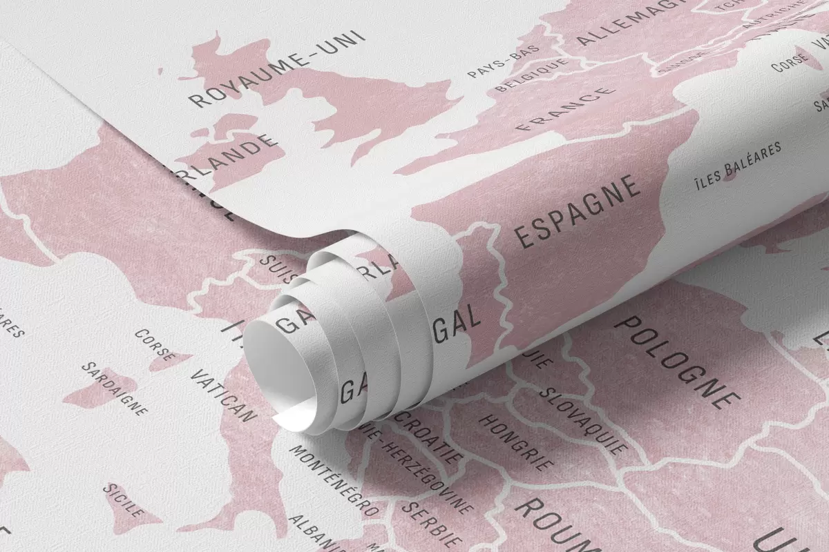 Fototapetai Vaikų žemėlapis akvarelės stiliumi su gyvūnais ir oro balionais. Prancūzų kalba. Rožinė spalva. Nr. c00001frv3