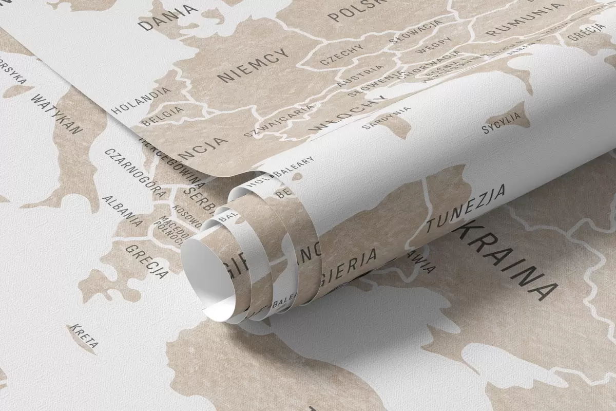 Fototapetai Vaikų žemėlapis akvarelės stiliumi su gyvūnais ir oro balionais. Lenkų kalba. Smėlio spalvos. Nr. c00001plv2