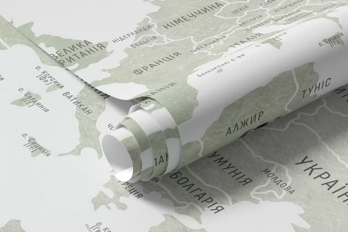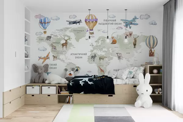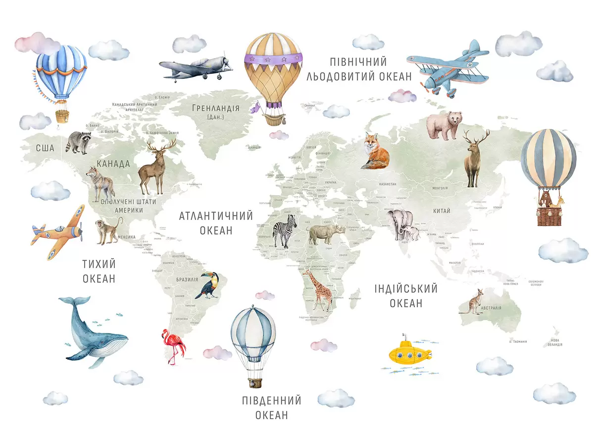 Fototapetai Vaikų žemėlapis akvarelės stiliumi su gyvūnais ir oro balionais. Ukrainiečių kalba. Žalia spalva. Nr. c00001uk