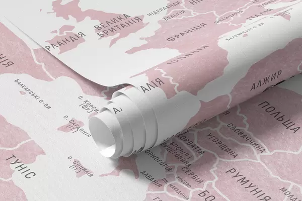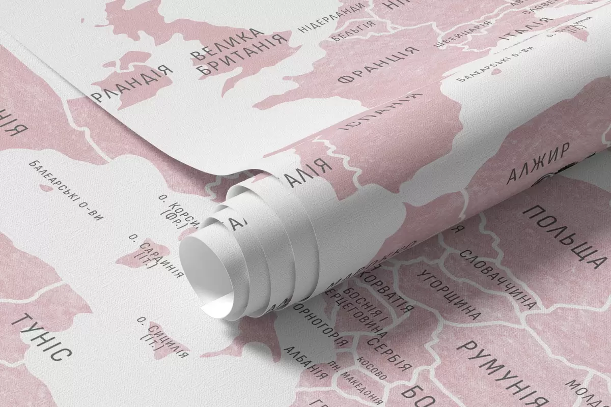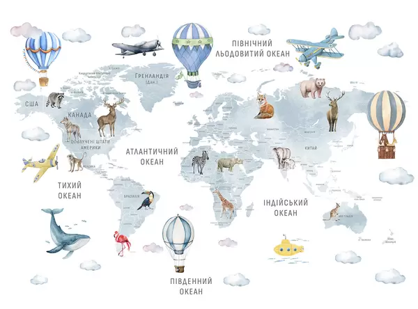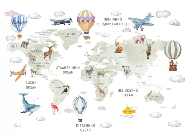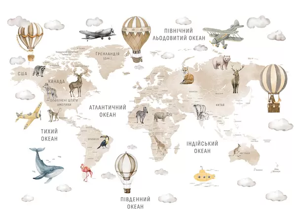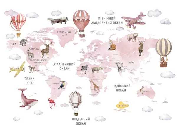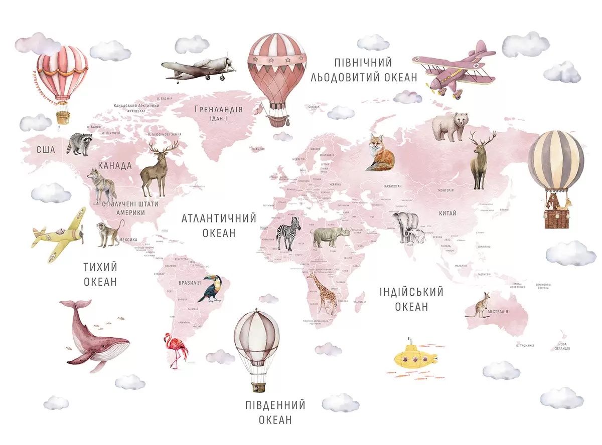 Fototapetai Vaikų žemėlapis akvarelės stiliumi su gyvūnais ir oro balionais. Ukrainiečių kalba. Rožinė spalva. Nr. c00001ukv3