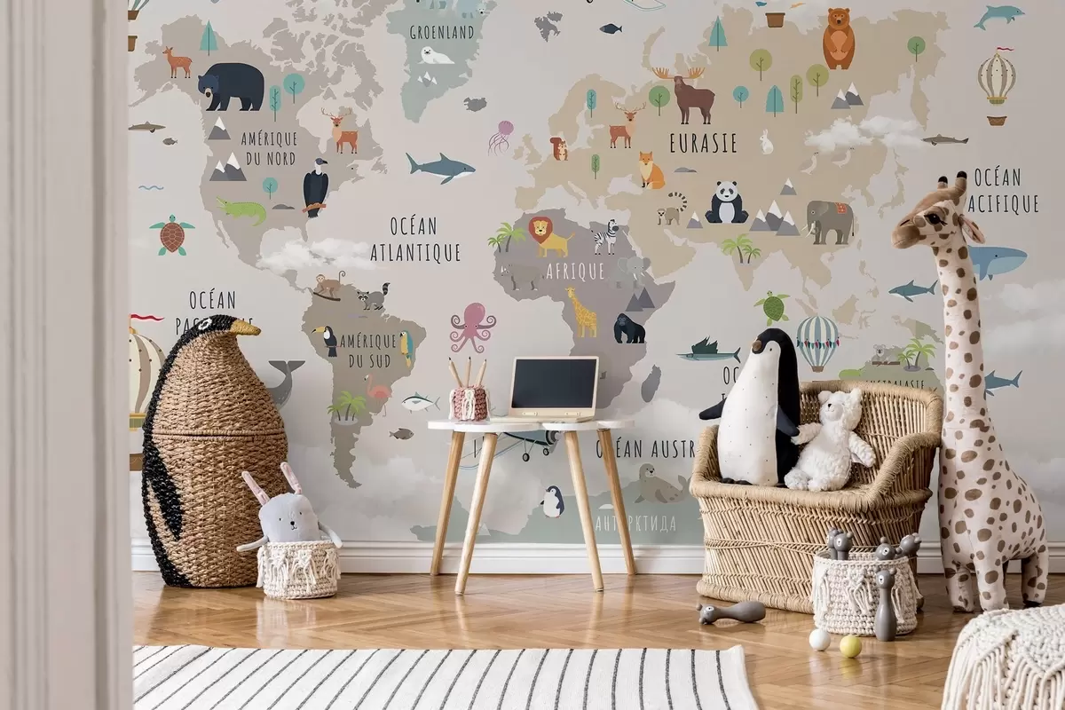 Fototapetai Vaikų pasaulio žemėlapis su gyvūnais ir oro balionais. Prancūzų kalba Nr. c00002fr