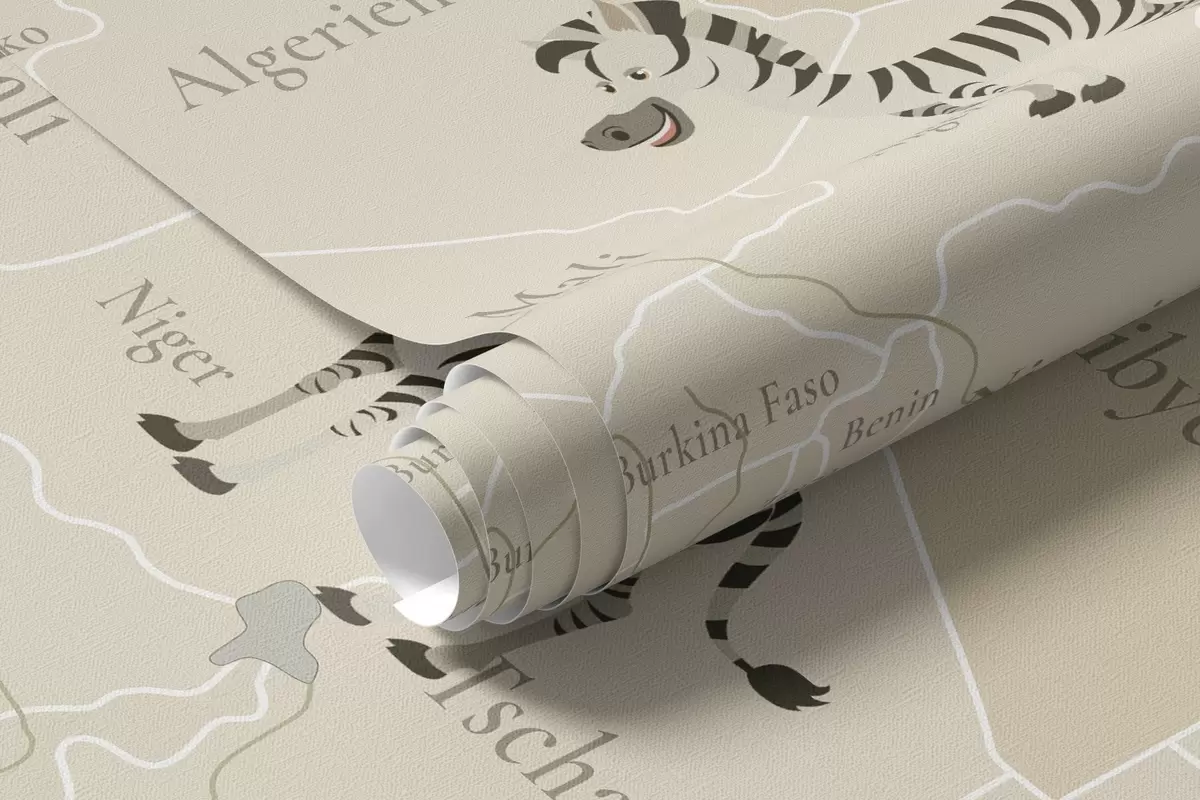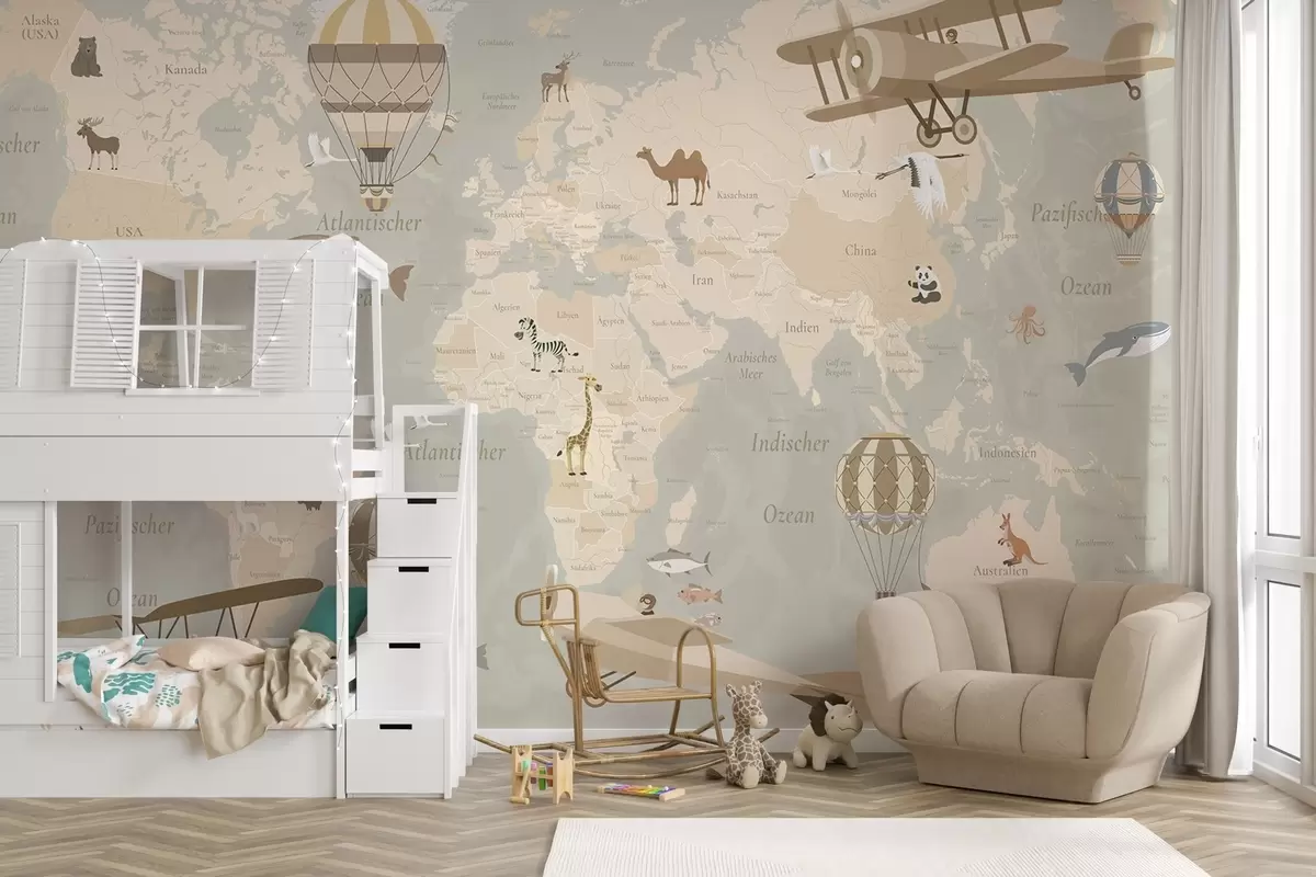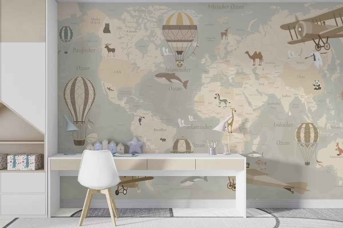 Fototapetai Vaikų pasaulio žemėlapis su gyvūnais, lėktuvais ir oro balionais. Vokiečių kalba. Smėlio spalvos Nr. c00003de