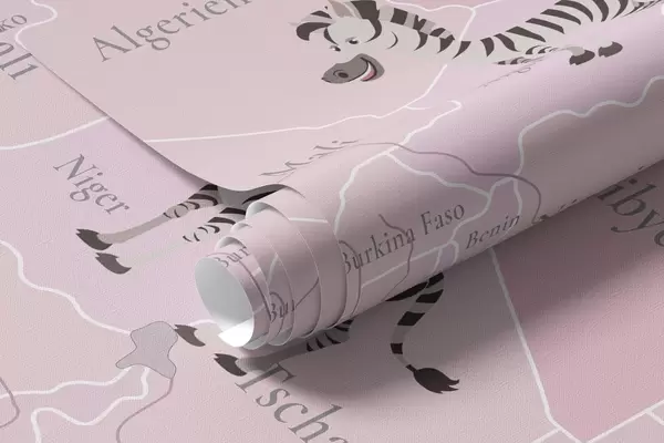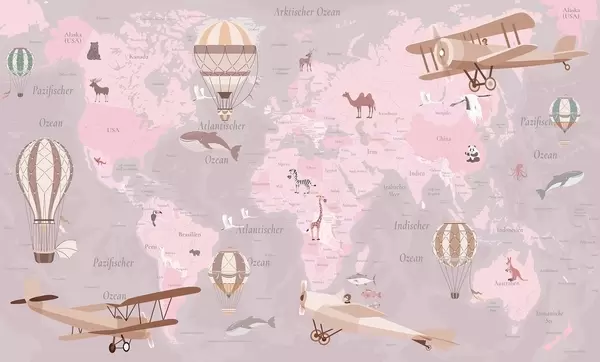Fototapetai Vaikų pasaulio žemėlapis su gyvūnais, lėktuvais ir oro balionais. Vokiečių kalba. Rožinė spalva. Nr. c00003dev3