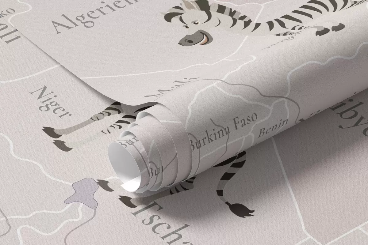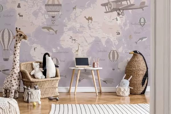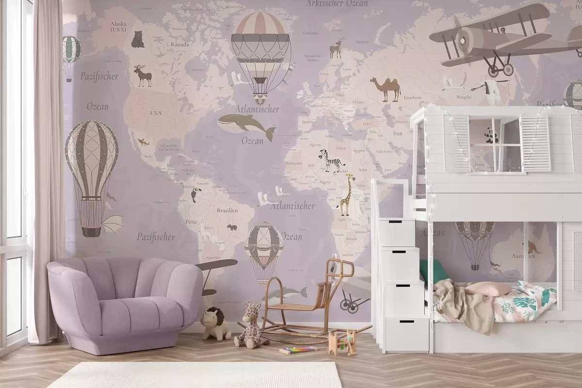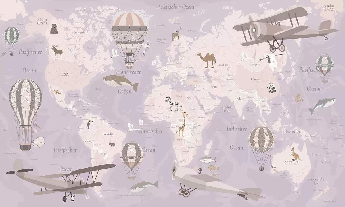 Fototapetai Vaikų pasaulio žemėlapis su gyvūnais, lėktuvais ir oro balionais. Vokiečių kalba. Violetinė spalva. Nr. c00003dev4