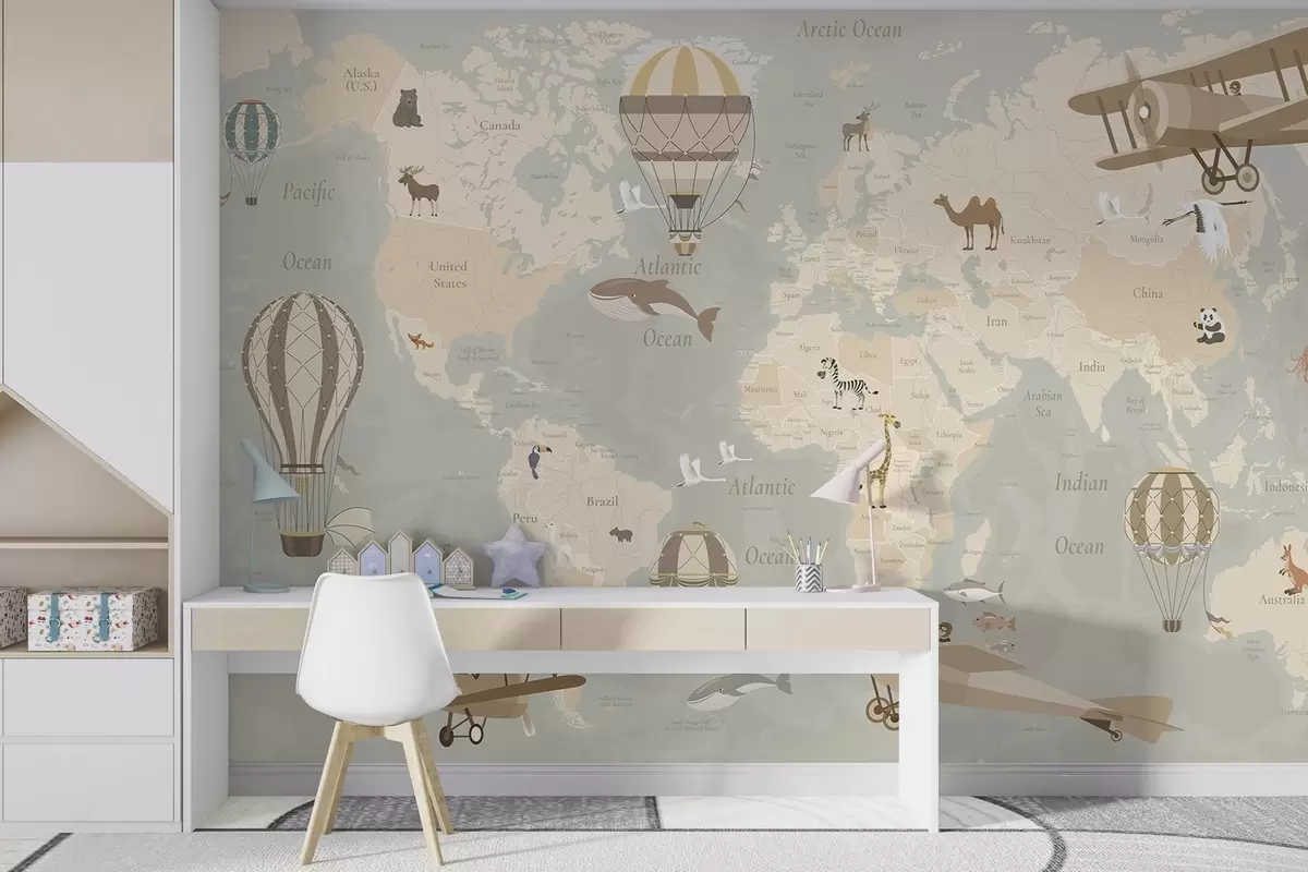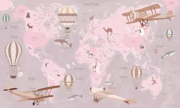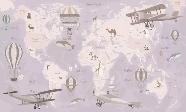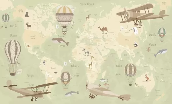 Fototapetai Vaikų pasaulio žemėlapis su gyvūnais, lėktuvais ir oro balionais. Anglų kalba. Smėlio spalvos. Nr. c00003en
