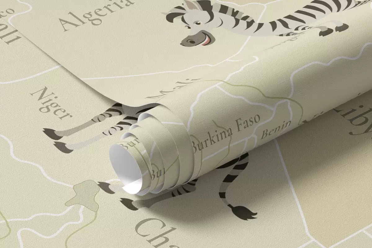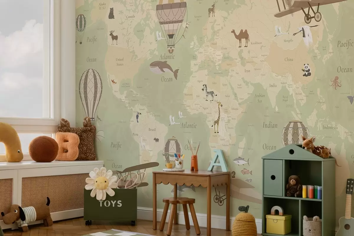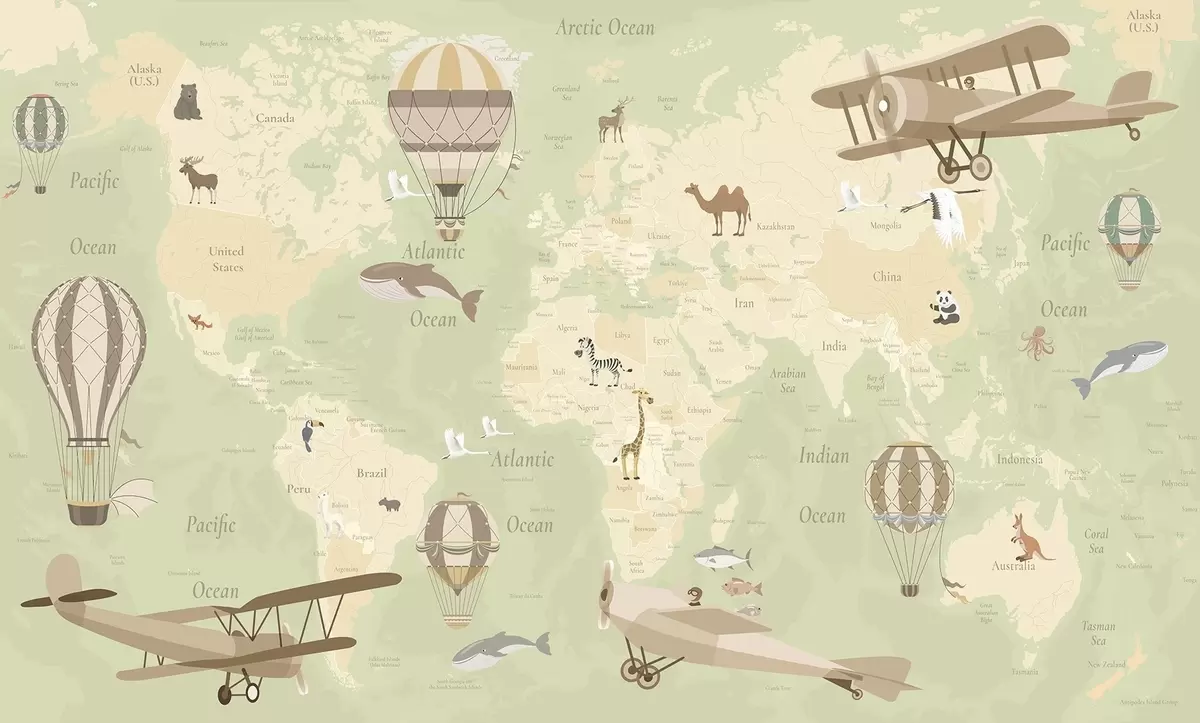 Fototapetai Vaikų pasaulio žemėlapis su gyvūnais, lėktuvais ir oro balionais. Anglų kalba. Žalia spalva. Nr. c00003env2