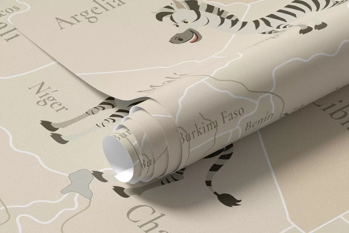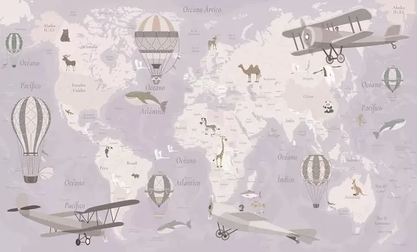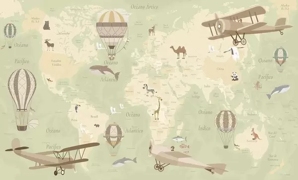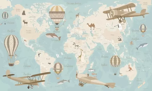 Fototapetai Vaikų pasaulio žemėlapis su gyvūnais, lėktuvais ir oro balionais. Ispanų kalba. Smėlio spalvos. Nr. c00003es